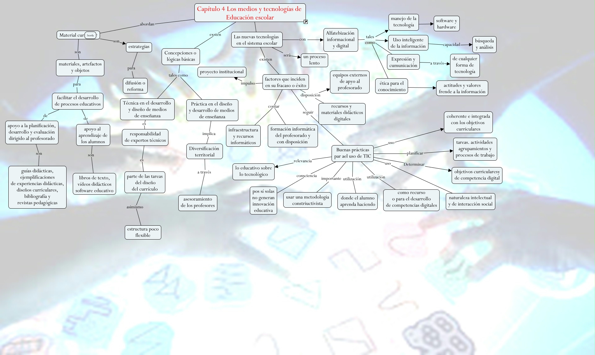 Este Cmap, tiene información relacionada con: Copia de Capítulo 4, Diversificación territorial a través asesoramiento de los profesores, Técnica en el desarrollo y diseño de medios de enseñanza es responsabilidad de expertos técnicos, factores que inciden en su fracaso o éxito contar infraestructura y recursos informáticos, manejo de la tecnología ???? software y hardware, Las nuevas tecnologías en el sistema escolar con Alfatebización informacional y digital, Las nuevas tecnologías en el sistema escolar existen factores que inciden en su fracaso o éxito, apoyo a la planificación, desarrollo y evaluación dirigido al profesorado son guías didácticas, ejemplificaciones de experiencias didácticas, diseños curriculares, bibliografía y revistas pedagógicas, Buenas prácticas par ael uso de TIC utilización como recurso o para el desarrollo de competencias digitales, Buenas prácticas par ael uso de TIC relevancia lo educativo sobre lo tecnológico, estrategias para difusión o reforma, Buenas prácticas par ael uso de TIC consciencia pos sí solas no generan innovación educativa, facilitar el desarrollo de procesos educativos de apoyo al aprendizaje de los alumnos, Uso inteligente de la información capacidad búsqueda y análisis, Concepciones o lógicas básicas tales como Técnica en el desarrollo y diseño de medios de enseñanza, Buenas prácticas par ael uso de TIC importante usar una metodologia constriuctivista, apoyo al aprendizaje de los alumnos son libros de texto, vídeos didácticos software educativo, Las nuevas tecnologías en el sistema escolar será un proceso lento, factores que inciden en su fracaso o éxito disposición recursos y materiales didácticos digitales, Capítulo 4 Los medios y tecnologías de Educación escolar exsten Concepciones o lógicas básicas, Expresión y cumunicación a través de cualquier forma de tecnología