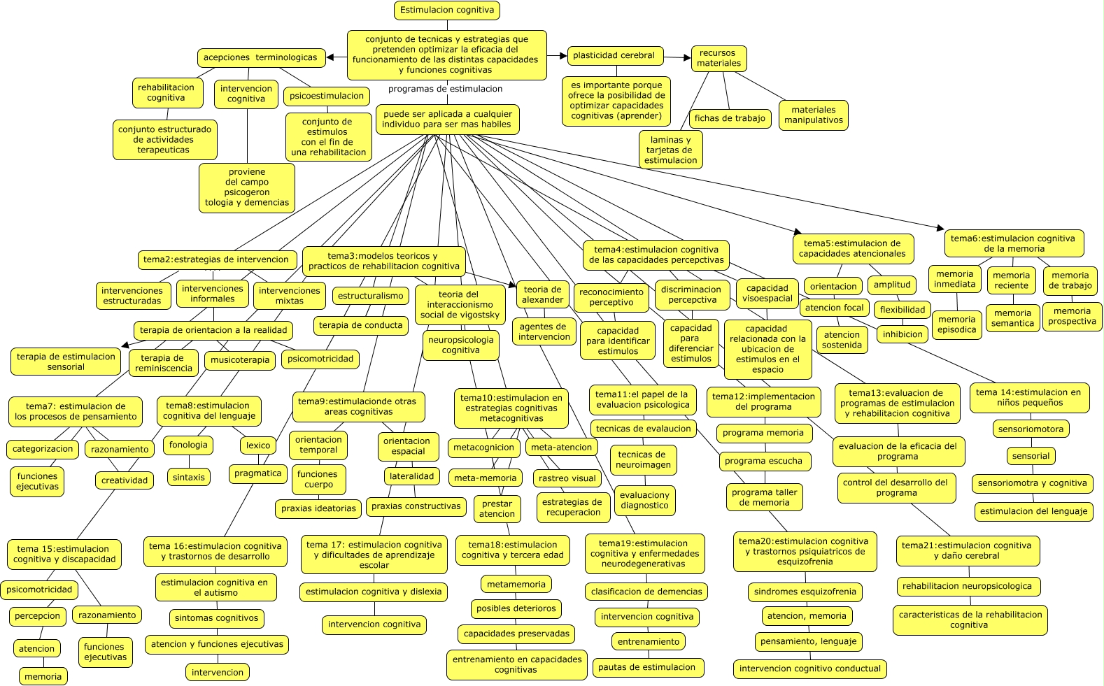 Este Cmap, tiene información relacionada con: Estimulacion cognitiva, terapia de orientacion a la realidad ???? terapia de reminiscencia, tema10:estimulacion en estrategias cognitivas metacognitivas ???? rastreo visual, sensoriomotra y cognitiva ???? estimulacion del lenguaje, plasticidad cerebral ???? es importante porque ofrece la posibilidad de optimizar capacidades cognitivas (aprender), orientacion temporal ???? funciones cuerpo, puede ser aplicada a cualquier individuo para ser mas habiles ???? tema3:modelos teoricos y practicos de rehabilitacion cognitiva, Estimulacion cognitiva ???? conjunto de tecnicas y estrategias que pretenden optimizar la eficacia del funcionamiento de las distintas capacidades y funciones cognitivas, atencion, memoria ???? pensamiento, lenguaje, tema 14:estimulacion en niños pequeños ???? sensoriomotora, puede ser aplicada a cualquier individuo para ser mas habiles ???? tema9:estimulacionde otras areas cognitivas, razonamiento ???? funciones ejecutivas, rehabilitacion cognitiva ???? conjunto estructurado de actividades terapeuticas, tema4:estimulacion cognitiva de las capacidades percepctivas ???? discriminacion percepctiva, tema7: estimulacion de los procesos de pensamiento ???? categorizacion, puede ser aplicada a cualquier individuo para ser mas habiles ???? tema 16:estimulacion cognitiva y trastornos de desarrollo, puede ser aplicada a cualquier individuo para ser mas habiles ???? tema12:implementacion del programa, tema19:estimulacion cognitiva y enfermedades neurodegenerativas ???? clasificacion de demencias, recursos materiales ???? laminas y tarjetas de estimulacion, puede ser aplicada a cualquier individuo para ser mas habiles ???? tema 15:estimulacion cognitiva y discapacidad, plasticidad cerebral ???? recursos materiales