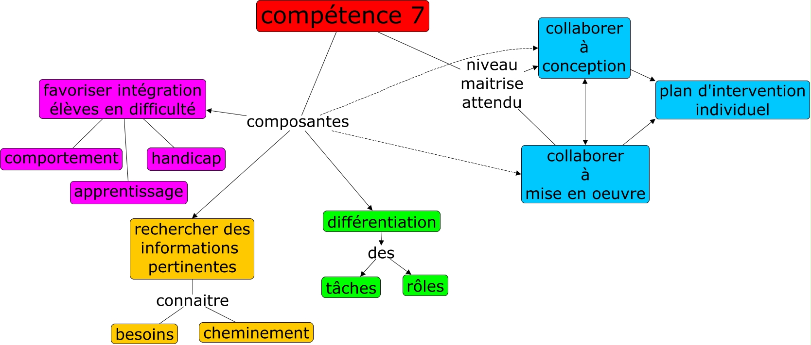 Cette carte de concepts créée avec IHMC CmapTools traite de: compétence 7, favoriser intégration élèves en difficulté comportement, collaborer à mise en oeuvre plan d'intervention individuel, rechercher des informations pertinentes connaitre besoins, compétence 7 composantes collaborer à conception, différentiation des tâches, favoriser intégration élèves en difficulté apprentissage, compétence 7 niveau maitrise attendu collaborer à conception, compétence 7 composantes différentiation, compétence 7 composantes favoriser intégration élèves en difficulté, compétence 7 niveau maitrise attendu collaborer à mise en oeuvre, collaborer à conception collaborer à mise en oeuvre, différentiation des rôles, rechercher des informations pertinentes connaitre cheminement, compétence 7 composantes collaborer à mise en oeuvre, favoriser intégration élèves en difficulté handicap, compétence 7 composantes rechercher des informations pertinentes, collaborer à conception plan d'intervention individuel