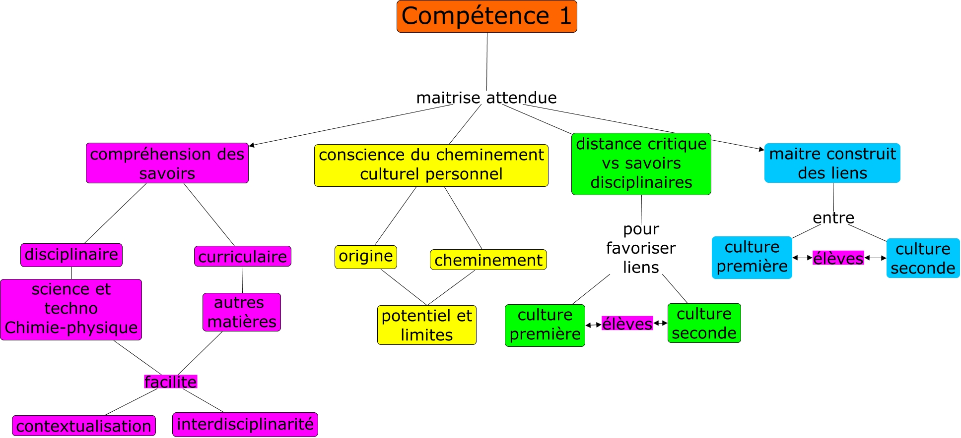 Cette carte de concepts créée avec IHMC CmapTools traite de: compétence 1, distance critique vs savoirs disciplinaires pour favoriser liens culture première, distance critique vs savoirs disciplinaires pour favoriser liens culture seconde, maitre construit des liens entre culture première, autres matières facilite contextualisation, origine potentiel et limites, science et techno Chimie-physique facilite contextualisation, compréhension des savoirs disciplinaire, Compétence 1 maitrise attendue distance critique vs savoirs disciplinaires, science et techno Chimie-physique facilite interdisciplinarité, autres matières facilite interdisciplinarité, Compétence 1 maitrise attendue maitre construit des liens, culture seconde élèves culture première, conscience du cheminement culturel personnel origine, compréhension des savoirs curriculaire, culture seconde élèves culture première, cheminement potentiel et limites, curriculaire autres matières, disciplinaire science et techno Chimie-physique, maitre construit des liens entre culture seconde, Compétence 1 maitrise attendue conscience du cheminement culturel personnel