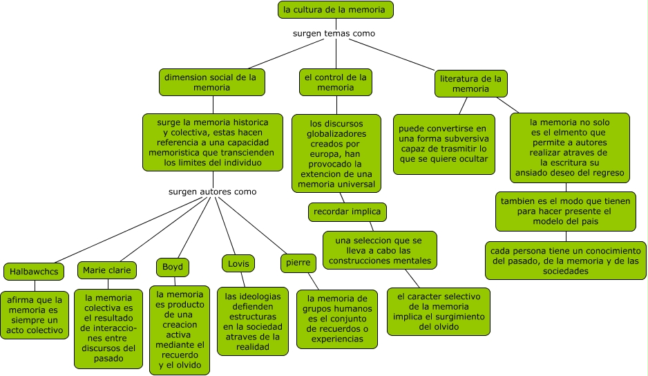 Este Cmap, tiene información relacionada con: la cultura de la memoria, pierre ???? la memoria de grupos humanos es el conjunto de recuerdos o experiencias, dimension social de la memoria ???? surge la memoria historica y colectiva, estas hacen referencia a una capacidad memoristica que transcienden los limites del individuo, surge la memoria historica y colectiva, estas hacen referencia a una capacidad memoristica que transcienden los limites del individuo surgen autores como pierre, Halbawchcs ???? afirma que la memoria es siempre un acto colectivo, la cultura de la memoria surgen temas como el control de la memoria, la cultura de la memoria surgen temas como dimension social de la memoria, el control de la memoria ???? los discursos globalizadores creados por europa, han provocado la extencion de una memoria universal, literatura de la memoria ???? puede convertirse en una forma subversiva capaz de trasmitir lo que se quiere ocultar, Marie clarie ???? la memoria colectiva es el resultado de interaccio- nes entre discursos del pasado, la memoria no solo es el elmento que permite a autores realizar atraves de la escritura su ansiado deseo del regreso ???? tambien es el modo que tienen para hacer presente el modelo del pais, surge la memoria historica y colectiva, estas hacen referencia a una capacidad memoristica que transcienden los limites del individuo surgen autores como Marie clarie, surge la memoria historica y colectiva, estas hacen referencia a una capacidad memoristica que transcienden los limites del individuo surgen autores como Lovis, recordar implica ???? una seleccion que se lleva a cabo las construcciones mentales, surge la memoria historica y colectiva, estas hacen referencia a una capacidad memoristica que transcienden los limites del individuo surgen autores como Boyd, la cultura de la memoria surgen temas como literatura de la memoria, una seleccion que se lleva a cabo las construcciones mentales ???? el caracter selectivo de la memoria implica el surgimiento del olvido, literatura de la memoria ???? la memoria no solo es el elmento que permite a autores realizar atraves de la escritura su ansiado deseo del regreso, Lovis ???? las ideologias defienden estructuras en la sociedad atraves de la realidad, tambien es el modo que tienen para hacer presente el modelo del pais ???? cada persona tiene un conocimiento del pasado, de la memoria y de las sociedades, los discursos globalizadores creados por europa, han provocado la extencion de una memoria universal ???? recordar implica