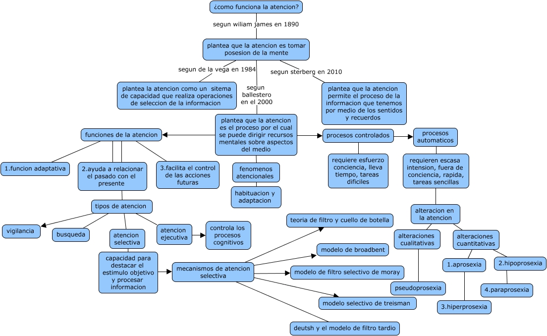 Este Cmap, tiene información relacionada con: como funciona la atencion, mecanismos de atencion selectiva ???? deutsh y el modelo de filtro tardio, capacidad para destacar el estimulo objetivo y procesar informacion ???? mecanismos de atencion selectiva, procesos controlados ???? requiere esfuerzo conciencia, lleva tiempo, tareas dificiles, tipos de atencion ???? atencion selectiva, requieren escasa intension, fuera de conciencia, rapida, tareas sencillas ???? alteracion en la atencion, plantea que la atencion es el proceso por el cual se puede dirigir recursos mentales sobre aspectos del medio ???? procesos controlados, atencion selectiva ???? capacidad para destacar el estimulo objetivo y procesar informacion, 2.hipoprosexia ???? 4.paraprosexia, funciones de la atencion ???? tipos de atencion, 1.aprosexia ???? 3.hiperprosexia, procesos controlados ???? procesos automaticos, alteracion en la atencion ???? alteraciones cualitativas, mecanismos de atencion selectiva ???? modelo de filtro selectivo de moray, plantea que la atencion es el proceso por el cual se puede dirigir recursos mentales sobre aspectos del medio ???? fenomenos atencionales, mecanismos de atencion selectiva ???? modelo selectivo de treisman, plantea que la atencion es tomar posesion de la mente segun de la vega en 1984 plantea la atencion como un sitema de capacidad que realiza operaciones de seleccion de la informacion, funciones de la atencion ???? 2.ayuda a relacionar el pasado con el presente, mecanismos de atencion selectiva ???? modelo de broadbent, alteracion en la atencion ???? alteraciones cuantitativas, tipos de atencion ???? atencion ejecutiva