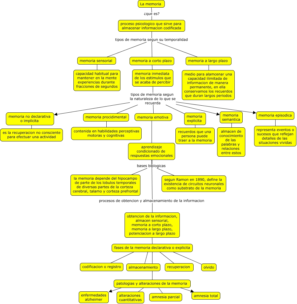 Este Cmap, tiene información relacionada con: La memoria, aprendizaje condicionado de respuestas emocionales bases biologicas la memoria depende del hipocampo de parte de los lobulos temporales de diversas partes de la corteza cerebral, talamo y corteza prefrontal, memoria inmediata de los estimulos que se acaba de percibir tipos de memoria segun la naturaleza de lo que se recuerda memoria no declarativa o implicita, memoria sensorial ???? capacidad habitual para mantener en la mente experiencias durante fracciones de segundos, memoria a largo plazo ???? medio para alamcenar una capacidad ilimitada de informacion de manera permanente, en ella conservamos los recuerdos que duran largos periodos, proceso psicologico que sirve para almacenar informacion codificada tipos de memoria segun su temporalidad memoria a corto plazo, obtencion de la informacion, almacen sensorial, memoria a corto plazo, memoria a largo plazo, potenciacion a largo plazo ???? fases de la memoria declarativa o explicita, patologias y alteraciones de la memoria ???? amnesia total, fases de la memoria declarativa o explicita ???? almacenamiento, memoria inmediata de los estimulos que se acaba de percibir tipos de memoria segun la naturaleza de lo que se recuerda memoria semantica, memoria procidimental ???? contenida en habilidades perceptivas motoras y cognitivas, memoria episodica ???? representa eventos o sucesos que reflejan detalles de las situaciones vividas, patologias y alteraciones de la memoria ???? enfermedades alzheimer, memoria inmediata de los estimulos que se acaba de percibir tipos de memoria segun la naturaleza de lo que se recuerda memoria explicita, aprendizaje condicionado de respuestas emocionales bases biologicas segun Ramon en 1890, define la existencia de circuitos neuronales como substrato de la memoria, fases de la memoria declarativa o explicita ???? olvido, La memoria ¿que es? proceso psicologico que sirve para almacenar informacion codificada, memoria semantica ???? almacen de conocimiento de las palabras y relaciones entre estos, proceso psicologico que sirve para almacenar informacion codificada tipos de memoria segun su temporalidad memoria a largo plazo, aprendizaje condicionado de respuestas emocionales procesos de obtencion y almacenamiento de la informacion obtencion de la informacion, almacen sensorial, memoria a corto plazo, memoria a largo plazo, potenciacion a largo plazo, fases de la memoria declarativa o explicita ???? codificacion o registro
