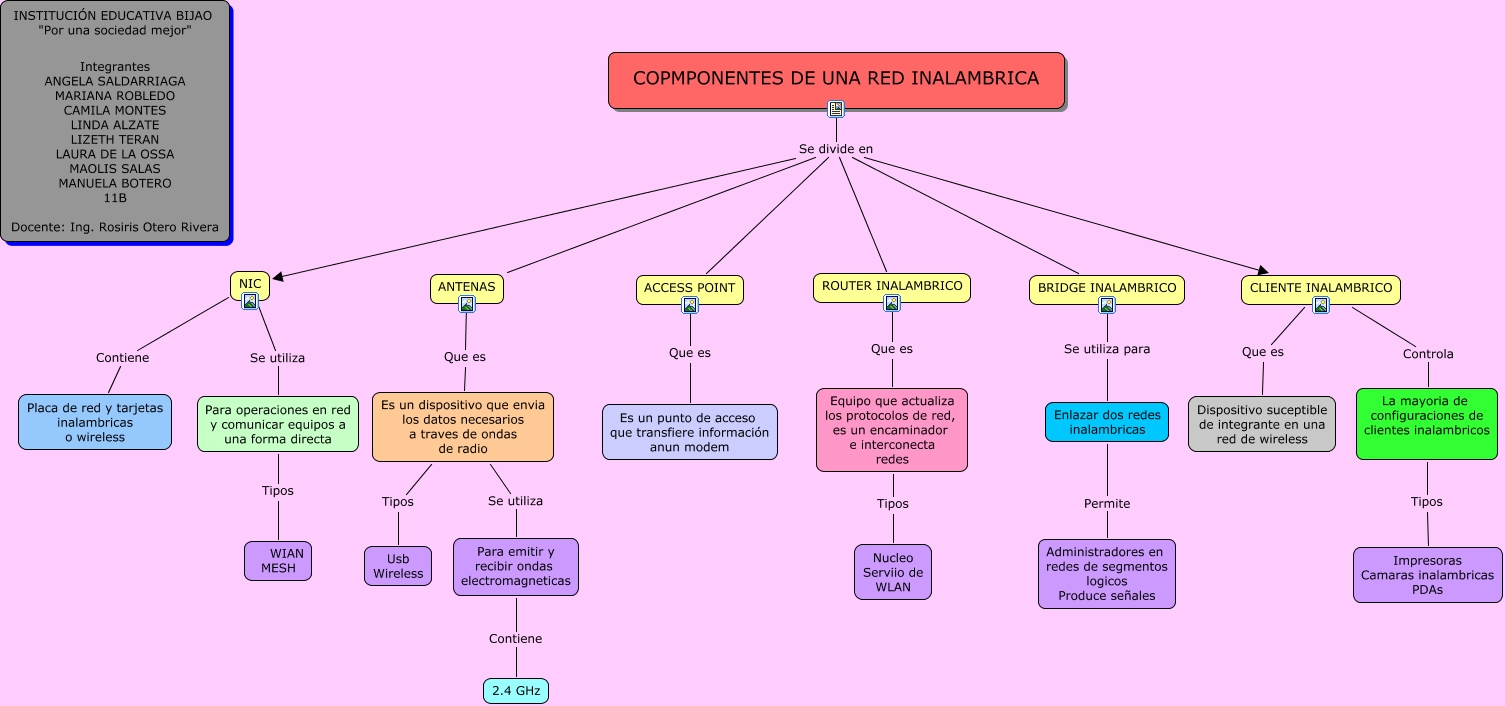 Este Cmap, tiene información relacionada con: componenteredinalambrica, ANTENAS Que es Es un dispositivo que envia los datos necesarios a traves de ondas de radio, NIC Se utiliza Para operaciones en red y comunicar equipos a una forma directa, ROUTER INALAMBRICO Que es Equipo que actualiza los protocolos de red, es un encaminador e interconecta redes, Enlazar dos redes inalambricas Permite Administradores en redes de segmentos logicos Produce señales, Para operaciones en red y comunicar equipos a una forma directa Tipos WIAN MESH, Equipo que actualiza los protocolos de red, es un encaminador e interconecta redes Tipos Nucleo Serviio de WLAN, CLIENTE INALAMBRICO Que es Dispositivo suceptible de integrante en una red de wireless, COPMPONENTES DE UNA RED INALAMBRICA Se divide en BRIDGE INALAMBRICO, Para emitir y recibir ondas electromagneticas Contiene 2.4 GHz, Es un dispositivo que envia los datos necesarios a traves de ondas de radio Se utiliza Para emitir y recibir ondas electromagneticas, COPMPONENTES DE UNA RED INALAMBRICA Se divide en ANTENAS, COPMPONENTES DE UNA RED INALAMBRICA Se divide en ROUTER INALAMBRICO, CLIENTE INALAMBRICO Controla La mayoria de configuraciones de clientes inalambricos, BRIDGE INALAMBRICO Se utiliza para Enlazar dos redes inalambricas, COPMPONENTES DE UNA RED INALAMBRICA Se divide en ACCESS POINT, La mayoria de configuraciones de clientes inalambricos Tipos Impresoras Camaras inalambricas PDAs, ACCESS POINT Que es Es un punto de acceso que transfiere información anun modem, NIC Contiene Placa de red y tarjetas inalambricas o wireless, COPMPONENTES DE UNA RED INALAMBRICA Se divide en CLIENTE INALAMBRICO, Es un dispositivo que envia los datos necesarios a traves de ondas de radio Tipos Usb Wireless