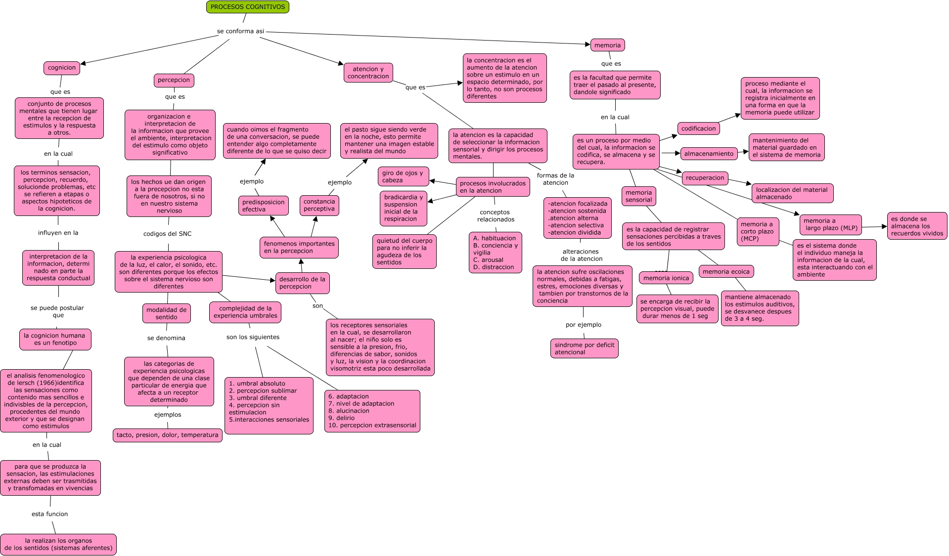 Este Cmap, tiene información relacionada con: mAPA COGNITIVO, procesos involucrados en la atencion conceptos relacionados A. habituacion B. conciencia y vigilia C. arousal D. distraccion, atencion y concentracion que es la concentracion es el aumento de la atencion sobre un estimulo en un espacio determinado, por lo tanto, no son procesos diferentes, procesos involucrados en la atencion ???? quietud del cuerpo para no inferir la agudeza de los sentidos, memoria que es es la facultad que permite traer el pasado al presente, dandole significado, es un proceso por medio del cual, la informacion se codifica, se almacena y se recupera. ???? memoria sensorial, es un proceso por medio del cual, la informacion se codifica, se almacena y se recupera. ???? almacenamiento, la experiencia psicologica de la luz, el calor, el sonido, etc. son diferentes porque los efectos sobre el sistema nervioso son diferentes ???? modalidad de sentido, constancia perceptiva ejemplo el pasto sigue siendo verde en la noche, esto permite mantener una imagen estable y realista del mundo, organizacion e interpretacion de la informacion que provee el ambiente, interpretacion del estimulo como objeto significativo ???? los hechos ue dan origen a la precepcion no esta fuera de nosotros, si no en nuestro sistema nervioso, los terminos sensacion, percepcion, recuerdo, solucionde problemas, etc se refieren a etapas o aspectos hipoteticos de la cognicion. influyen en la interpretacion de la informacion, determi nado en parte la respuesta conductual, es un proceso por medio del cual, la informacion se codifica, se almacena y se recupera. ???? memoria a corto plazo (MCP), complejidad de la experiencia umbrales son los siguientes 1. umbral absoluto 2. percepcion sublimar 3. umbral diferente 4. percepcion sin estimulacion 5.interacciones sensoriales, PROCESOS COGNITIVOS se conforma asi percepcion, el analisis fenomenologico de lersch (1966)identifica las sensaciones como contenido mas sencillos e indivisbles de la percepcion, procedentes del mundo exterior y que se designan como estimulos en la cual para que se produzca la sensacion, las estimulaciones externas deben ser trasmitidas y transfomadas en vivencias, procesos involucrados en la atencion ???? giro de ojos y cabeza, memoria sensorial ???? es la capacidad de registrar sensaciones percibidas a traves de los sentidos, memoria a largo plazo (MLP) ???? es donde se almacena los recuerdos vividos, es la facultad que permite traer el pasado al presente, dandole significado en la cual es un proceso por medio del cual, la informacion se codifica, se almacena y se recupera., memoria a corto plazo (MCP) ???? es el sistema donde el individuo maneja la informacion de la cual, esta interactuando con el ambiente, la atencion es la capacidad de seleccionar la informacion sensorial y dirigir los procesos mentales. procesos involucrados en la atencion