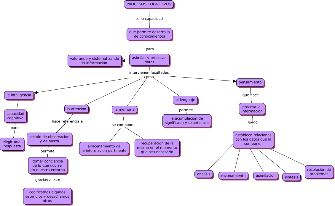 Este Cmap, tiene información relacionada con: proceso cog, establece relaciones con los datos que la componen ???? sintesis, asimilar y procesar datos intervienen facultades como pensamiento, asimilar y procesar datos intervienen facultades como la memoria, asimilar y procesar datos intervienen facultades como la inteligencia, asimilar y procesar datos intervienen facultades como la atencion, establece relaciones con los datos que la componen ???? analisis, procesa la informacion luego establece relaciones con los datos que la componen, la atencion hace referencia a estado de observacion y de alerta, asimilar y procesar datos intervienen facultades como el lenguaje, PROCESOS COGNITIVOS es la capacidad que permite desarrollo de conocimientos, capacidad cognitiva para elegir una respuesta, asimilar y procesar datos ???? valorando y sistematizando la informacion, establece relaciones con los datos que la componen ???? razonamiento, tomar conciencia de lo que ocurre en nuestro entorno gracias a esto codificamos algunos estimulos y desachamos otros, pensamiento que hace procesa la informacion, que permite desarrollo de conocimientos para asimilar y procesar datos, el lenguaje permite la acumulacion de significado y experiencia, establece relaciones con los datos que la componen ???? asimilacion, establece relaciones con los datos que la componen ???? resolucion de problemas, la memoria se compone recuperacion de la misma en el momento que sea necesario