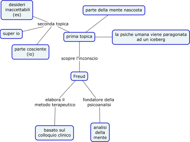 Questa Cmap, creata con IHMC CmapTools, contiene informazioni relative a: Inconscio, prima topica scopre l'inconscio Freud, prima topica seconda topica parte cosciente (io), parte della mente nascosta prima topica, desideri inaccettabili (es) seconda topica parte cosciente (io), super io seconda topica parte cosciente (io), prima topica la psiche umana viene paragonata ad un iceberg, Freud fondatore della psicoanalisi analisi della mente, Freud elabora il metodo terapeutico basato sul colloquio clinico