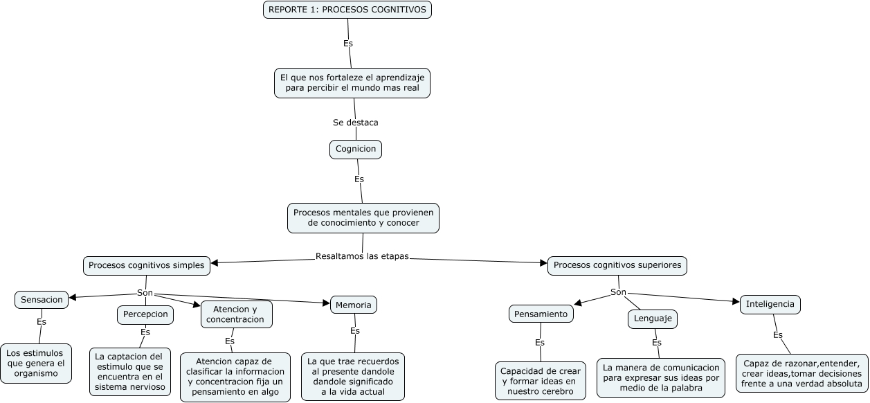 Este Cmap, tiene información relacionada con: PROCESOS COGNITIVOS, Cognicion Es Procesos mentales que provienen de conocimiento y conocer, Atencion y concentracion Es Atencion capaz de clasificar la informacion y concentracion fija un pensamiento en algo, Percepcion Es La captacion del estimulo que se encuentra en el sistema nervioso, Procesos cognitivos simples Son Sensacion, Procesos cognitivos simples Son Percepcion, Procesos cognitivos superiores Son Lenguaje, Procesos cognitivos simples Son Atencion y concentracion, REPORTE 1: PROCESOS COGNITIVOS Es El que nos fortaleze el aprendizaje para percibir el mundo mas real, Lenguaje Es La manera de comunicacion para expresar sus ideas por medio de la palabra, Procesos mentales que provienen de conocimiento y conocer Resaltamos las etapas Procesos cognitivos simples, Procesos cognitivos superiores Son Pensamiento, Sensacion Es Los estimulos que genera el organismo, Memoria Es La que trae recuerdos al presente dandole dandole significado a la vida actual, Pensamiento Es Capacidad de crear y formar ideas en nuestro cerebro, Procesos mentales que provienen de conocimiento y conocer Resaltamos las etapas Procesos cognitivos superiores, El que nos fortaleze el aprendizaje para percibir el mundo mas real Se destaca Cognicion, Inteligencia Es Capaz de razonar,entender, crear ideas,tomar decisiones frente a una verdad absoluta, Procesos cognitivos simples Son Memoria, Procesos cognitivos superiores Son Inteligencia