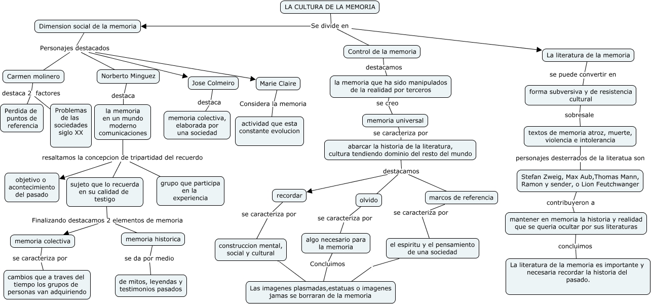 Este Cmap, tiene información relacionada con: LA CULTURA DE LA MEMORIA, Marie Claire Considera la memoria actividad que esta constante evolucion, el espiritu y el pensamiento de una sociedad Las imagenes plasmadas,estatuas o imagenes jamas se borraran de la memoria, olvido se caracteriza por algo necesario para la memoria, Control de la memoria destacamos la memoria que ha sido manipulados de la realidad por terceros, LA CULTURA DE LA MEMORIA Se divide en La literatura de la memoria, construccion mental, social y cultural Las imagenes plasmadas,estatuas o imagenes jamas se borraran de la memoria, recordar se caracteriza por construccion mental, social y cultural, Norberto Minguez destaca la memoria en un mundo moderno comunicaciones, memoria colectiva se caracteriza por cambios que a traves del tiempo los grupos de personas van adquiriendo, Stefan Zweig, Max Aub,Thomas Mann, Ramon y sender, o Lion Feutchwanger contribuyeron a mantener en memoria la historia y realidad que se queria ocultar por sus literaturas, la memoria en un mundo moderno comunicaciones resaltamos la concepcion de tripartidad del recuerdo sujeto que lo recuerda en su calidad de testigo, textos de memoria atroz, muerte, violencia e intolerancia personajes desterrados de la literatua son Stefan Zweig, Max Aub,Thomas Mann, Ramon y sender, o Lion Feutchwanger, Carmen molinero destaca 2 factores Problemas de las sociedades siglo XX, Dimension social de la memoria Personajes destacados Marie Claire, Dimension social de la memoria Personajes destacados Jose Colmeiro, abarcar la historia de la literatura, cultura tendiendo dominio del resto del mundo destacamos recordar, Jose Colmeiro destaca memoria colectiva, elaborada por una sociedad, La literatura de la memoria se puede convertir en forma subversiva y de resistencia cultural, marcos de referencia se caracteriza por el espiritu y el pensamiento de una sociedad, algo necesario para la memoria Concluimos Las imagenes plasmadas,estatuas o imagenes jamas se borraran de la memoria