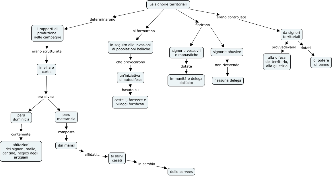 Questa Cmap, creata con IHMC CmapTools, contiene informazioni relative a: le signorie territoriali 3bls, ai servi casati in cambio delle corvees, Le signorie territoriali fiorirono signorie vescovili e monastiche, da signori territoriali provvedevano alla difesa del territorio, alla giustizia, pars massaricia composta dai mansi, Le signorie territoriali si formarono in seguito alle invasioni di popolazioni belliche, pars dominicia contenente abitazioni dei signori, stalle, cantine, negozi degli artigiani, in seguito alle invasioni di popolazioni belliche che provocarono un'iniziativa di autodifesa, signorie abusive non ricevendo nessuna delega, signorie vescovili e monastiche dotate immunità e delega dall'alto, i rapporti di produzione nelle campagne erano strutturate in villa o curtis, in villa o curtis era divisa pars dominicia, un'iniziativa di autodifesa basato su castelli, fortezze e vilaggi fortificati, Le signorie territoriali determinarono i rapporti di produzione nelle campagne, Le signorie territoriali fiorirono signorie abusive, Le signorie territoriali erano controllate da signori territoriali, in villa o curtis era divisa pars massaricia, dai mansi affidati ai servi casati, da signori territoriali dotati di potere di banno