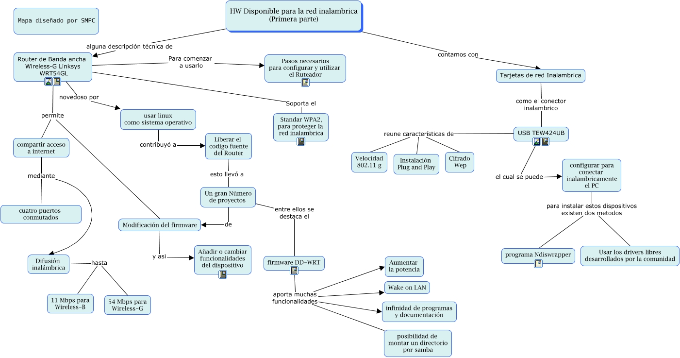 Este Cmap, tiene información relacionada con: dispositivos inalambricos, Difusión inalámbrica hasta 54 Mbps para Wireless-G, usar linux como sistema operativo contribuyó a Liberar el codigo fuente del Router, Un gran Número de proyectos de Modificación del firmware, Difusión inalámbrica hasta 11 Mbps para Wireless-B, USB TEW424UB reune características de Cifrado Wep, Tarjetas de red Inalambrica como el conector inalambrico USB TEW424UB, compartir acceso a internet mediante cuatro puertos conmutados, Un gran Número de proyectos entre ellos se destaca el firmware DD-WRT, Router de Banda ancha Wireless-G Linksys WRT54GL Para comenzar a usarlo Pasos necesarios para configurar y utilizar el Ruteador, firmware DD-WRT aporta muchas funcionalidades Aumentar la potencia, Liberar el codigo fuente del Router esto llevó a Un gran Número de proyectos, Router de Banda ancha Wireless-G Linksys WRT54GL permite Modificación del firmware, Router de Banda ancha Wireless-G Linksys WRT54GL permite compartir acceso a internet, USB TEW424UB el cual se puede configurar para conectar inalambricamente el PC, configurar para conectar inalambricamente el PC para instalar estos dispositivos existen dos metodos Usar los drivers libres desarrollados por la comunidad, Modificación del firmware y asi Añadir o cambiar funcionalidades del dispositivo, HW Disponible para la red inalambrica (Primera parte) alguna descripción técnica de Router de Banda ancha Wireless-G Linksys WRT54GL, compartir acceso a internet mediante Difusión inalámbrica, firmware DD-WRT aporta muchas funcionalidades infinidad de programas y documentación, firmware DD-WRT aporta muchas funcionalidades posibilidad de montar un directorio por samba
