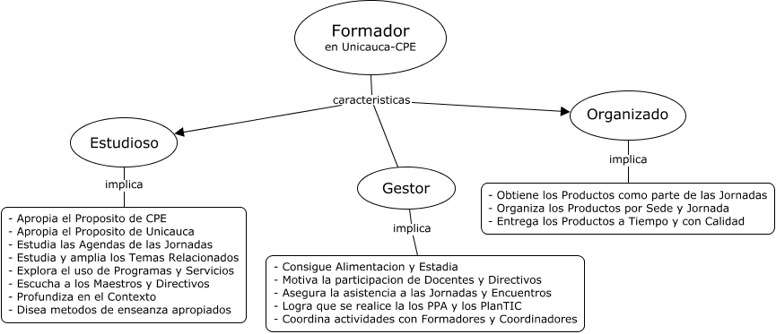 Este Cmap, tiene información relacionada con: Caracteristicas-Formadores_EFA2010-PA, Formador en Unicauca-CPE caracteristicas Estudioso, Gestor implica - Consigue Alimentacion y Estadia - Motiva la participacion de Docentes y Directivos - Asegura la asistencia a las Jornadas y Encuentros - Logra que se realice la los PPA y los PlanTIC - Coordina actividades con Formadores y Coordinadores, Formador en Unicauca-CPE caracteristicas Gestor, Formador en Unicauca-CPE caracteristicas Organizado, Organizado implica - Obtiene los Productos como parte de las Jornadas - Organiza los Productos por Sede y Jornada - Entrega los Productos a Tiempo y con Calidad, Estudioso implica - Apropia el Proposito de CPE - Apropia el Proposito de Unicauca - Estudia las Agendas de las Jornadas - Estudia y amplia los Temas Relacionados - Explora el uso de Programas y Servicios - Escucha a los Maestros y Directivos - Profundiza en el Contexto - Disea metodos de enseanza apropiados