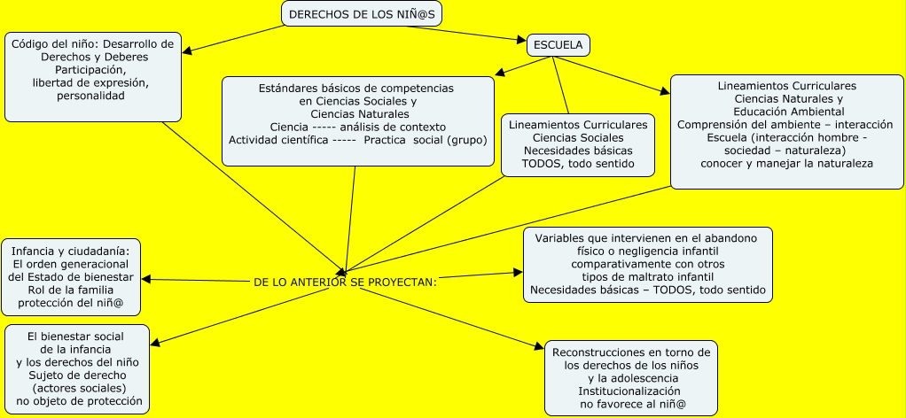 Este Cmap, tiene información relacionada con: 3_Mapa-de-Antedecentes, Lineamientos Curriculares Ciencias Sociales Necesidades básicas TODOS, todo sentido ????, Estándares básicos de competencias en Ciencias Sociales y Ciencias Naturales Ciencia ----- análisis de contexto Actividad científica ----- Practica social (grupo) DE LO ANTERIOR SE PROYECTAN: Variables que intervienen en el abandono físico o negligencia infantil comparativamente con otros tipos de maltrato infantil Necesidades básicas – TODOS, todo sentido, Estándares básicos de competencias en Ciencias Sociales y Ciencias Naturales Ciencia ----- análisis de contexto Actividad científica ----- Practica social (grupo) DE LO ANTERIOR SE PROYECTAN: El bienestar social de la infancia y los derechos del niño Sujeto de derecho (actores sociales) no objeto de protección, ESCUELA ???? Lineamientos Curriculares Ciencias Naturales y Educación Ambiental Comprensión del ambiente – interacción Escuela (interacción hombre - sociedad – naturaleza) conocer y manejar la naturaleza, Estándares básicos de competencias en Ciencias Sociales y Ciencias Naturales Ciencia ----- análisis de contexto Actividad científica ----- Practica social (grupo) DE LO ANTERIOR SE PROYECTAN: Reconstrucciones en torno de los derechos de los niños y la adolescencia Institucionalización no favorece al niñ@, Estándares básicos de competencias en Ciencias Sociales y Ciencias Naturales Ciencia ----- análisis de contexto Actividad científica ----- Practica social (grupo) DE LO ANTERIOR SE PROYECTAN: Infancia y ciudadanía: El orden generacional del Estado de bienestar Rol de la familia protección del niñ@, ESCUELA ???? Estándares básicos de competencias en Ciencias Sociales y Ciencias Naturales Ciencia ----- análisis de contexto Actividad científica ----- Practica social (grupo), Lineamientos Curriculares Ciencias Naturales y Educación Ambiental Comprensión del ambiente – interacción Escuela (interacción hombre - sociedad – naturaleza) conocer y manejar la naturaleza ????, ESCUELA ???? Lineamientos Curriculares Ciencias Sociales Necesidades básicas TODOS, todo sentido, DERECHOS DE LOS NIÑ@S ???? ESCUELA, Código del niño: Desarrollo de Derechos y Deberes Participación, libertad de expresión, personalidad ????, DERECHOS DE LOS NIÑ@S ???? Código del niño: Desarrollo de Derechos y Deberes Participación, libertad de expresión, personalidad