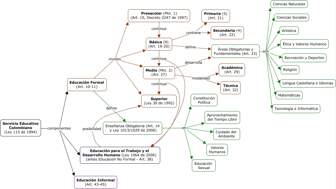 Este Cmap, tiene información relacionada con: _Estructura_Servicio_Educativo, Áreas Obligatorias y Fundamentales (Art. 23) son Ciencias Naturales, Básica (9) (Art. 19-20) continua Media (Min. 2) (Art. 27), Enseñanza Obligatoria (Art. 14 y Ley 1013/1029 de 2006) en Educación Sexual, Servicio Educativo Colombiano (Ley 115 de 1994) componentes Educación para el Trabajo y el Desarrollo Humano (Ley 1064 de 2006) (antes Educación No Formal - Art. 38), Áreas Obligatorias y Fundamentales (Art. 23) son Ética y Valores Humanos, Básica (9) (Art. 19-20) contiene Primaria (5) (Art. 21), Áreas Obligatorias y Fundamentales (Art. 23) son Matemáticas, Educación Formal (Art. 10-11) niveles Superior (Ley 30 de 1992), Enseñanza Obligatoria (Art. 14 y Ley 1013/1029 de 2006) en Valores Humanos, Básica (9) (Art. 19-20) continua Educación para el Trabajo y el Desarrollo Humano (Ley 1064 de 2006) (antes Educación No Formal - Art. 38), Áreas Obligatorias y Fundamentales (Art. 23) son Recreación y Deportes, Áreas Obligatorias y Fundamentales (Art. 23) son Religión, Educación para el Trabajo y el Desarrollo Humano (Ley 1064 de 2006) (antes Educación No Formal - Art. 38) posibilidad Superior (Ley 30 de 1992), Preescolar (Min. 1) (Art. 15, Decreto 2247 de 1997) continua Básica (9) (Art. 19-20), Áreas Obligatorias y Fundamentales (Art. 23) son Lengua Castellana e Idiomas, Educación Formal (Art. 10-11) niveles Preescolar (Min. 1) (Art. 15, Decreto 2247 de 1997), Básica (9) (Art. 19-20) define Áreas Obligatorias y Fundamentales (Art. 23), Educación Formal (Art. 10-11) niveles Básica (9) (Art. 19-20), Enseñanza Obligatoria (Art. 14 y Ley 1013/1029 de 2006) en Cuidado del Ambiente, Educación Formal (Art. 10-11) niveles Media (Min. 2) (Art. 27)
