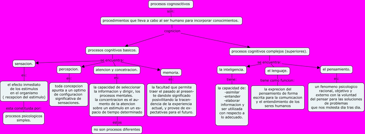 Este Cmap, tiene información relacionada con: 1 PROCESOS COGNITIVOS, el lenguaje. tiene como funcion: la exprecion del pensamiento de forma escrita para la comunicacion y el entendimiento de los seres humanos, procesos cognitivos basicos. se encuentra: sensacion., procesos cognoscitivos son: procedimientos que lleva a cabo al ser humano para incorporar conocimientos., procesos cognitivos complejos (superiores). se encuentra: el lenguaje., el pensamiento. es: un fenomeno psicologico racional, objetivo y externo con la voluntad del pensar para las soluciones de problemas que nos molesta dia tras dia., procedimientos que lleva a cabo al ser humano para incorporar conocimientos. cognicion procesos cognitivos basicos., la inteligencia. tiene: la capacidad de: -asimilar -entender -elaborar informacion y ser utilizada con respecto a lo adecuado., memoria. es: la facultad que permite traer el pasado al presen- te dandole significado posivilitando la tracen- dencia de la experiencia actual, y provee de ex- pectativas para el futuro., el efecto inmediato de los estimulos en el organismo ( recepcion del estimulo) esta constituida por: procesos psicologicos simples., procesos cognitivos basicos. se encuentra: memoria., sensacion. es: el efecto inmediato de los estimulos en el organismo ( recepcion del estimulo), procesos cognitivos basicos. se encuentra: atencion y concetracion., procesos cognitivos complejos (superiores). se encuentra: la inteligencia., procesos cognitivos complejos (superiores). se encuentra: el pensamiento., procedimientos que lleva a cabo al ser humano para incorporar conocimientos. cognicion procesos cognitivos complejos (superiores)., atencion y concetracion. es: la capacidad de seleccionar la informacion y dirigir, los procesos mentales. la concentracion es el au- mento de la atencion sobre un estimulo en un es- pacio de tiempo determinado, la capacidad de seleccionar la informacion y dirigir, los procesos mentales. la concentracion es el au- mento de la atencion sobre un estimulo en un es- pacio de tiempo determinado estos no son procesos diferentes, procesos cognitivos basicos. se encuentra: percepcion., percepcion. es: toda concepcion apunta a un optimo de configuracion significativa de sensaciones.