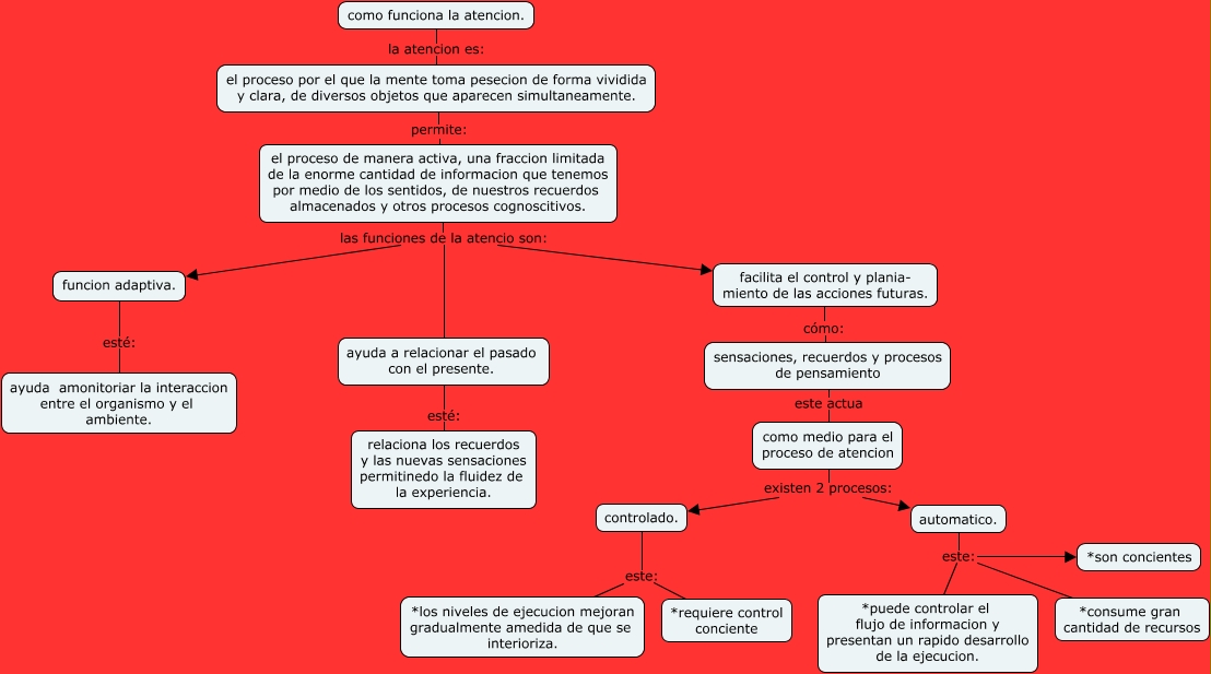 Este Cmap, tiene información relacionada con: COMO FUNCIONA LA ATENCION, como funciona la atencion. la atencion es: el proceso por el que la mente toma pesecion de forma vividida y clara, de diversos objetos que aparecen simultaneamente., como medio para el proceso de atencion existen 2 procesos: controlado., el proceso de manera activa, una fraccion limitada de la enorme cantidad de informacion que tenemos por medio de los sentidos, de nuestros recuerdos almacenados y otros procesos cognoscitivos. las funciones de la atencio son: ayuda a relacionar el pasado con el presente., controlado. este: *los niveles de ejecucion mejoran gradualmente amedida de que se interioriza., facilita el control y plania- miento de las acciones futuras. cómo: sensaciones, recuerdos y procesos de pensamiento, ayuda a relacionar el pasado con el presente. esté: relaciona los recuerdos y las nuevas sensaciones permitinedo la fluidez de la experiencia., sensaciones, recuerdos y procesos de pensamiento este actua como medio para el proceso de atencion, automatico. este: *puede controlar el flujo de informacion y presentan un rapido desarrollo de la ejecucion., automatico. este: *son concientes, el proceso de manera activa, una fraccion limitada de la enorme cantidad de informacion que tenemos por medio de los sentidos, de nuestros recuerdos almacenados y otros procesos cognoscitivos. las funciones de la atencio son: funcion adaptiva., el proceso por el que la mente toma pesecion de forma vividida y clara, de diversos objetos que aparecen simultaneamente. permite: el proceso de manera activa, una fraccion limitada de la enorme cantidad de informacion que tenemos por medio de los sentidos, de nuestros recuerdos almacenados y otros procesos cognoscitivos., como medio para el proceso de atencion existen 2 procesos: automatico., el proceso de manera activa, una fraccion limitada de la enorme cantidad de informacion que tenemos por medio de los sentidos, de nuestros recuerdos almacenados y otros procesos cognoscitivos. las funciones de la atencio son: facilita el control y plania- miento de las acciones futuras., controlado. este: *requiere control conciente, automatico. este: *consume gran cantidad de recursos, funcion adaptiva. esté: ayuda amonitoriar la interaccion entre el organismo y el ambiente.