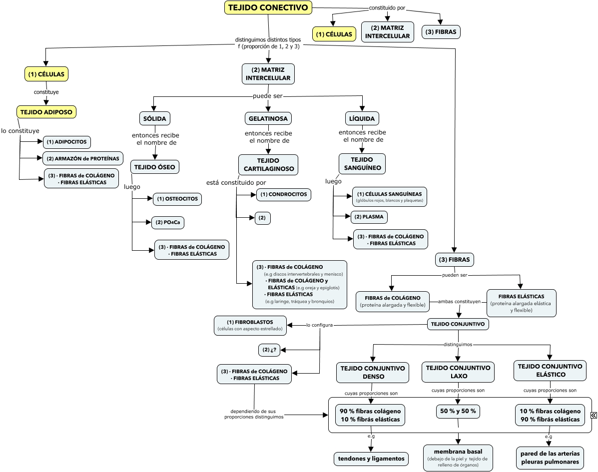 Este Cmap, tiene información relacionada con: 3.3.2 Tejido conectivo, 90 % fibras colágeno 10 % fibrás elásticas e.g tendones y ligamentos, FIBRAS de COLÁGENO (proteína alargada y flexible) ambas constituyen TEJIDO CONJUNTIVO, TEJIDO CARTILAGINOSO está constituido por (1) CONDROCITOS, TEJIDO CONECTIVO constituido por (2) MATRIZ INTERCELULAR, TEJIDO SANGUÍNEO luego (3) · FIBRAS de COLÁGENO · FIBRAS ELÁSTICAS, TEJIDO CONJUNTIVO ELÁSTICO cuyas proporciones son 10 % fibras colágeno 90 % fibrás elásticas, (3) · FIBRAS de COLÁGENO · FIBRAS ELÁSTICAS dependiendo de sus proporciones distinguimos ????, (1) CÉLULAS constituye TEJIDO ADIPOSO, FIBRAS ELÁSTICAS (proteína alargada elástica y flexible) ambas constituyen TEJIDO CONJUNTIVO, TEJIDO CONJUNTIVO lo configura (3) · FIBRAS de COLÁGENO · FIBRAS ELÁSTICAS, (3) FIBRAS pueden ser FIBRAS ELÁSTICAS (proteína alargada elástica y flexible), TEJIDO ÓSEO luego (1) OSTEOCITOS, TEJIDO ADIPOSO lo constituye (2) ARMAZÓN de PROTEÍNAS, TEJIDO CONJUNTIVO distinguimos TEJIDO CONJUNTIVO ELÁSTICO, SÓLIDA entonces recibe el nombre de TEJIDO ÓSEO, (3) FIBRAS pueden ser FIBRAS de COLÁGENO (proteína alargada y flexible), TEJIDO CONJUNTIVO lo configura (2) ¿?, (2) MATRIZ INTERCELULAR puede ser GELATINOSA, TEJIDO SANGUÍNEO luego (1) CÉLULAS SANGUÍNEAS (glóbulos rojos, blancos y plaquetas), TEJIDO CONJUNTIVO DENSO cuyas proporciones son 90 % fibras colágeno 10 % fibrás elásticas