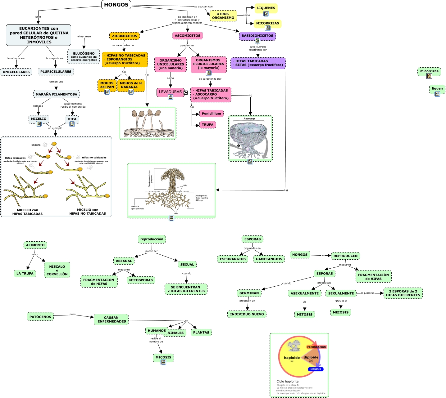 Este Cmap, tiene información relacionada con: 7.10 Hongos, HONGOS se asocian con OTROS ORGANISMO, HIFA un ejemplo, · HIFAS TABICADAS · SETAS (=cuerpo fructífero) e.g, · HIFAS TABICADAS · ASCOCARPO (=cuerpo fructífero) e.g TRUFA, ORGANISMOS PLURICELULARES (la mayoría) se caracteriza por · HIFAS TABICADAS · ASCOCARPO (=cuerpo fructífero), PLURICELULARES forman una MARAÑA FILAMENTOSA, CAUSAN ENFERMEDADES en PLANTAS, ASEXUAL mediante FRAGMENTACIÓN de HIFAS, ESPORAS producidas ASEXUALMENTE, ESPORAS originadas en GAMETANGIOS, ESPORAS cuando GERMINAN, GERMINAN producen un INDIVIDUO NUEVO, BASIDIOMICETOS cuyo cuerpos fructíferos son · HIFAS TABICADAS · SETAS (=cuerpo fructífero), · HIFAS TABICADAS · ASCOCARPO (=cuerpo fructífero) e.g Penicillium, MARAÑA FILAMENTOSA llamada MICELIO, CAUSAN ENFERMEDADES en ANIMALES, HUMANOS recibe el nombre de MICOSIS, REPRODUCEN mediante ESPORAS, ASEXUALMENTE vía MITOSIS, ASCOMICETOS pueden ser ORGANISMO UNICELULARES (una minoría)