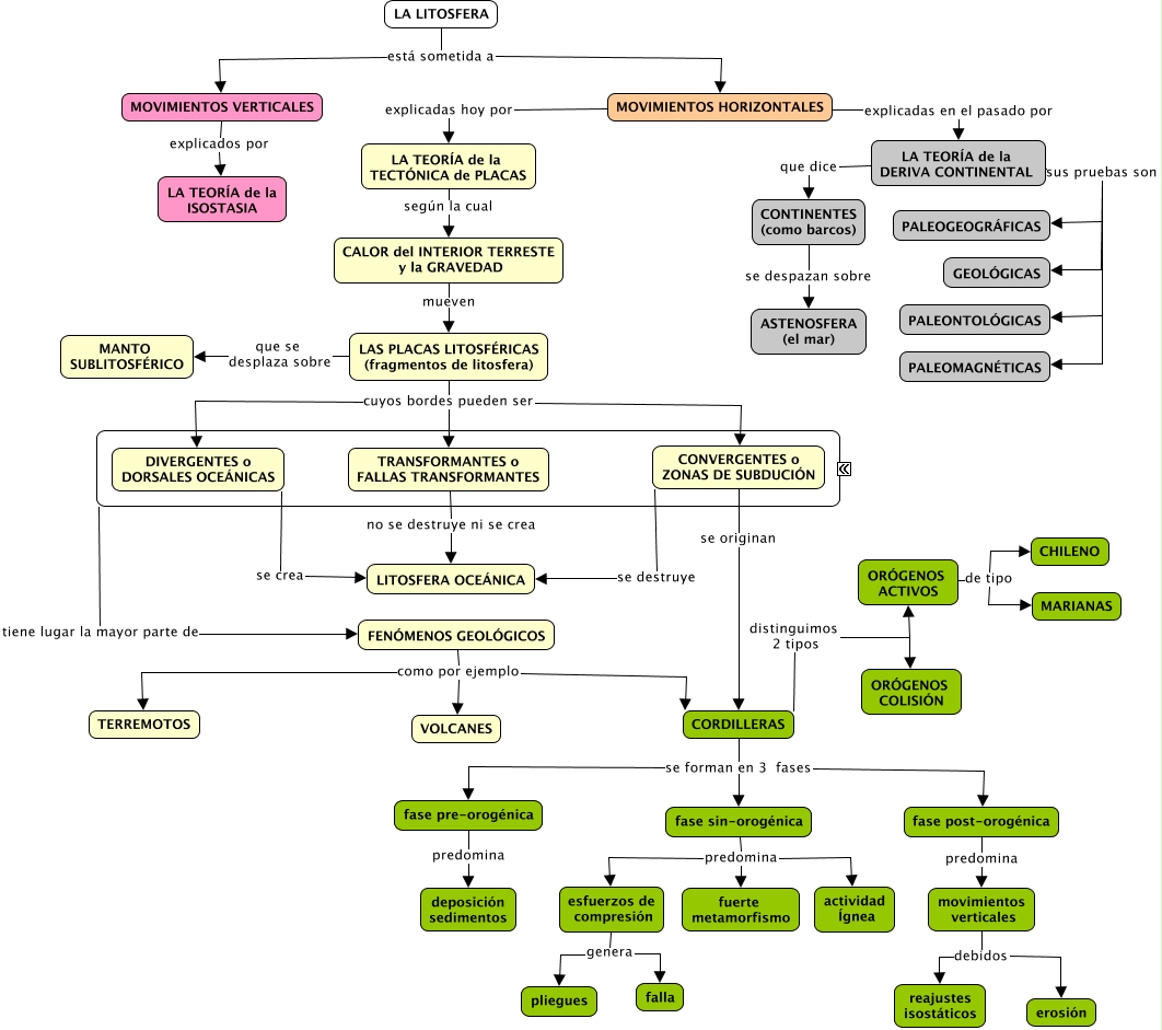 Este Cmap, tiene información relacionada con: La litosfera y sus movimientos horizontales, FENÓMENOS GEOLÓGICOS como por ejemplo TERREMOTOS, movimientos verticales debidos erosión, fase sin-orogénica predomina fuerte metamorfismo, CORDILLERAS se forman en 3 fases fase post-orogénica, LA TEORÍA de la DERIVA CONTINENTAL sus pruebas son GEOLÓGICAS, fase post-orogénica predomina movimientos verticales, DIVERGENTES o DORSALES OCEÁNICAS se crea LITOSFERA OCEÁNICA, esfuerzos de compresión genera falla, LA LITOSFERA está sometida a MOVIMIENTOS VERTICALES, LA LITOSFERA está sometida a MOVIMIENTOS HORIZONTALES, LA TEORÍA de la DERIVA CONTINENTAL que dice CONTINENTES (como barcos), LA TEORÍA de la TECTÓNICA de PLACAS según la cual CALOR del INTERIOR TERRESTE y la GRAVEDAD, LA TEORÍA de la DERIVA CONTINENTAL sus pruebas son PALEONTOLÓGICAS, MOVIMIENTOS VERTICALES explicados por LA TEORÍA de la ISOSTASIA, LAS PLACAS LITOSFÉRICAS (fragmentos de litosfera) que se desplaza sobre MANTO SUBLITOSFÉRICO, ORÓGENOS ACTIVOS de tipo MARIANAS, movimientos verticales debidos reajustes isostáticos, BORDES DE PLACA tiene lugar la mayor parte de FENÓMENOS GEOLÓGICOS, esfuerzos de compresión genera pliegues, ORÓGENOS ACTIVOS de tipo CHILENO