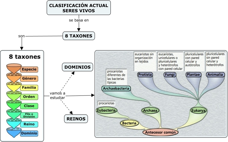 Este Cmap, tiene información relacionada con: 7.05 Clasificación actual de los seres vivos, 8 TAXONES son, vamos a estudiar REINOS, CLASIFICACIÓN ACTUAL SERES VIVOS se basa en 8 TAXONES, vamos a estudiar, vamos a estudiar DOMINIOS