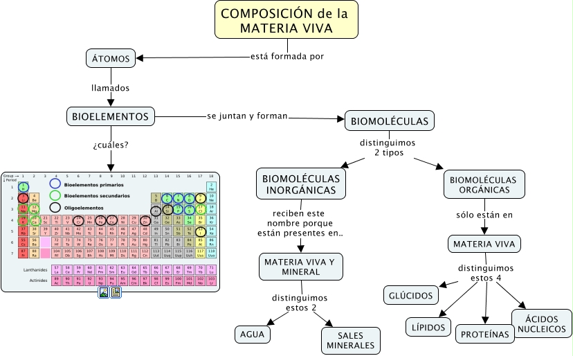 Este Cmap, tiene información relacionada con: 6.02 Componentes de los seres vivos, BIOMOLÉCULAS distinguimos 2 tipos BIOMOLÉCULAS ORGÁNICAS, MATERIA VIVA distinguimos estos 4 GLÚCIDOS, BIOMOLÉCULAS INORGÁNICAS reciben este nombre porque están presentes en.. MATERIA VIVA Y MINERAL, COMPOSICIÓN de la MATERIA VIVA está formada por ÁTOMOS, MATERIA VIVA distinguimos estos 4 LÍPIDOS, BIOMOLÉCULAS distinguimos 2 tipos BIOMOLÉCULAS INORGÁNICAS, MATERIA VIVA distinguimos estos 4 PROTEÍNAS, MATERIA VIVA Y MINERAL distinguimos estos 2 SALES MINERALES, MATERIA VIVA Y MINERAL distinguimos estos 2 AGUA, ÁTOMOS llamados BIOELEMENTOS, BIOELEMENTOS se juntan y forman BIOMOLÉCULAS, MATERIA VIVA distinguimos estos 4 ÁCIDOS NUCLEICOS, BIOELEMENTOS ¿cuáles?, BIOMOLÉCULAS ORGÁNICAS sólo están en MATERIA VIVA