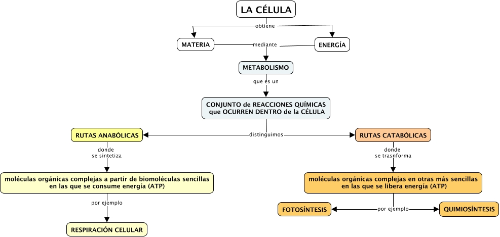 Este Cmap, tiene información relacionada con: 6.12 Metabolismo celular, CONJUNTO de REACCIONES QUÍMICAS que OCURREN DENTRO de la CÉLULA distinguimos RUTAS ANABÓLICAS, moléculas orgánicas complejas a partir de biomoléculas sencillas en las que se consume energía (ATP) por ejemplo RESPIRACIÓN CELULAR, MATERIA mediante METABOLISMO, moléculas orgánicas complejas en otras más sencillas en las que se libera energía (ATP) por ejemplo QUIMIOSÍNTESIS, RUTAS CATABÓLICAS donde se trasnforma moléculas orgánicas complejas en otras más sencillas en las que se libera energía (ATP), CONJUNTO de REACCIONES QUÍMICAS que OCURREN DENTRO de la CÉLULA distinguimos RUTAS CATABÓLICAS, METABOLISMO que es un CONJUNTO de REACCIONES QUÍMICAS que OCURREN DENTRO de la CÉLULA, RUTAS ANABÓLICAS donde se sintetiza moléculas orgánicas complejas a partir de biomoléculas sencillas en las que se consume energía (ATP), ENERGÍA mediante METABOLISMO, moléculas orgánicas complejas en otras más sencillas en las que se libera energía (ATP) por ejemplo FOTOSÍNTESIS, LA CÉLULA obtiene ENERGÍA, LA CÉLULA obtiene MATERIA