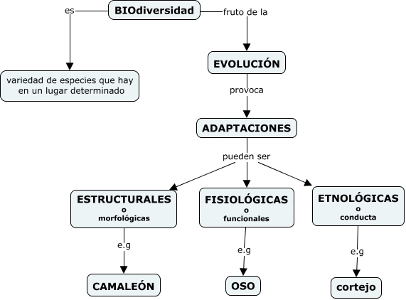 Este Cmap, tiene información relacionada con: 7.11 Beneficios de la bacterias y los hongosBiodiversidad, BIOdiversidad fruto de la EVOLUCIÓN, BIOdiversidad es variedad de especies que hay en un lugar determinado, EVOLUCIÓN provoca ADAPTACIONES, ADAPTACIONES pueden ser ESTRUCTURALES o morfológicas, ETNOLÓGICAS o conducta e.g cortejo, ESTRUCTURALES o morfológicas e.g CAMALEÓN, FISIOLÓGICAS o funcionales e.g OSO, ADAPTACIONES pueden ser ETNOLÓGICAS o conducta, ADAPTACIONES pueden ser FISIOLÓGICAS o funcionales