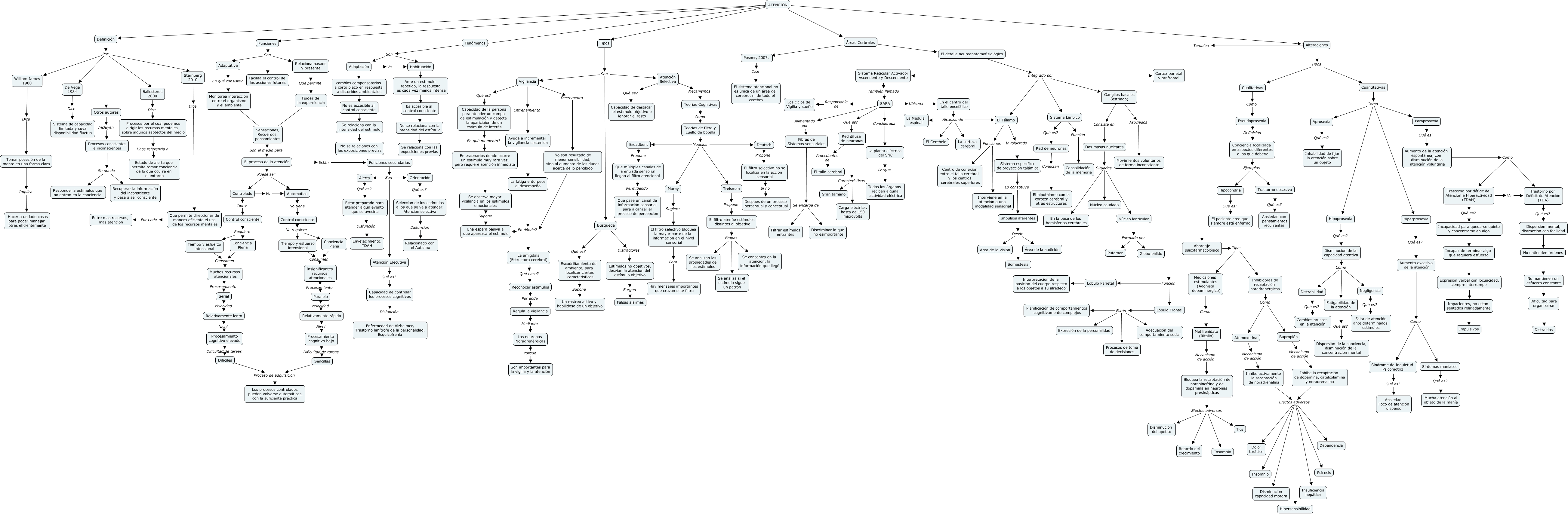 Este Cmap, tiene información relacionada con: Atención, Dispersión mental, distracción con facilidad ???? No entienden órdenes, Que múltiples canales de la entrada sensorial llegan al filtro atencional Permitiendo Que pase un canal de información sensorial para alcanzar el proceso de percepción, Control consciente Requiere Conciencia Plena, El filtro atenúe estímulos distintos al objetivo Etapas Se analizan las propiedades de los estímulos, Funciones secundarias Son Atención Ejecutiva, El detalle neuroanatomofisiológico Integrado por Sistema Reticular Activador Ascendente y Descendente, Bloquea la recaptación de norepinefrina y de dopamina en neuronas presinápticas Efectos adversos Retardo del crecimiento, Aumento excesivo de la atención Como Síntomas maniacos, Inhibe la recaptación de dopamina, catelcolamina y noradrenalina Efectos adversos Insuficiencia hepática, Ganglios basales (estriado) Asociados Movimientos voluntarios de forma inconsciente, Búsqueda Distractores Estímulos no objetivos, desvían la atención del estímulo objetivo, La amígdala (Estructura cerebral) Qué hace? Reconocer estímulos, Impulsos aferentes Desde Área de la visión, Medicaiones estimulantes (Agonista dopaminérgico) Como Metilfenidato (Ritalin), Negligencia Qué es? Falta de atención ante determinados estímulos, En escenarios donde ocurre un estímulo muy rara vez, pero requiere atención inmediata ???? Se observa mayor vigilancia en los estímulos emocionales, Ayuda a incrementar la vigilancia sostenida ???? La fatiga entorpece el desempeño, Tipos Son Vigilancia, Lóbulo Frontal Están Procesos de toma de decisiones, Cuantitativas Como Hiperprosexia