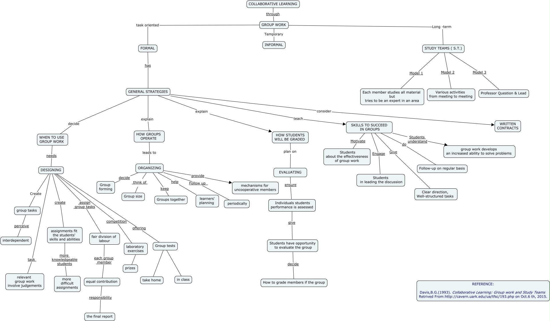 This Concept Map, created with IHMC CmapTools, has information related to: Untitled, SKILLS TO SUCCEED IN GROUPS Students understand group work develops an increased ability to solve problems, ORGANIZING decide Group forming, EVALUATING ensure Individuals students performance is assessed, GROUP WORK Long -term STUDY TEAMS ( S.T.), GENERAL STRATEGIES decide WHEN TO USE GROUP WORK, equal contribution responsibility the final report, HOW GROUPS OPERATE leads to ORGANIZING, COLLABORATIVE LEARNING through GROUP WORK, Students have opportunity to evaluate the group decide How to grade members if the group, prizes ???? laboratory exercises, group tasks perceive interdependent, STUDY TEAMS ( S.T.) Model 3 Professor Question & Lead, ORGANIZING keep Groups together, GENERAL STRATEGIES explain HOW STUDENTS WILL BE GRADED, DESIGNING offering Group tests, STUDY TEAMS ( S.T.) Model 1 Each member studies all material but tries to be an expert in an area, Group tests in class, ORGANIZING help learners' planning, Individuals students performance is assessed give Students have opportunity to evaluate the group, Group tests ???? take home