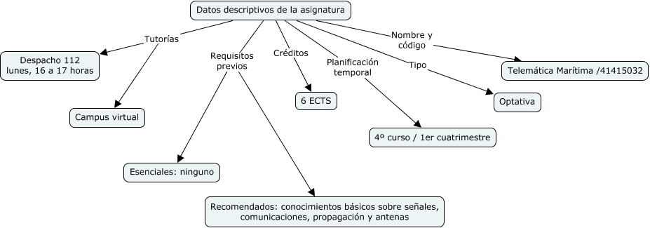 Este Cmap, tiene información relacionada con: Datos descriptivos de la asignatura, Datos descriptivos de la asignatura Tutorías Despacho 112 lunes, 16 a 17 horas, Datos descriptivos de la asignatura Créditos 6 ECTS, Datos descriptivos de la asignatura Requisitos previos Recomendados: conocimientos básicos sobre señales, comunicaciones, propagación y antenas, Datos descriptivos de la asignatura Planificación temporal 4º curso / 1er cuatrimestre, Datos descriptivos de la asignatura Tutorías Campus virtual, Datos descriptivos de la asignatura Nombre y código Telemática Marítima /41415032, Datos descriptivos de la asignatura Requisitos previos Esenciales: ninguno, Datos descriptivos de la asignatura Tipo Optativa