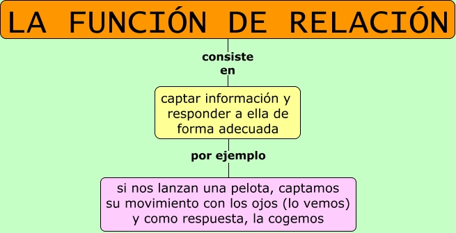 Este Cmap, tiene información relacionada con: La función de relación, captar información y responder a ella de forma adecuada por ejemplo si nos lanzan una pelota, captamos su movimiento con los ojos (lo vemos) y como respuesta, la cogemos, LA FUNCIÓN DE RELACIÓN consiste en captar información y responder a ella de forma adecuada