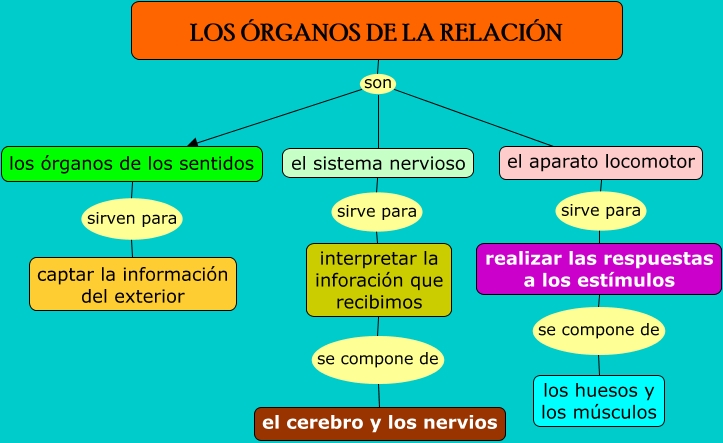 Este Cmap, tiene información relacionada con: Los órganos de la relación, LOS ÓRGANOS DE LA RELACIÓN son el sistema nervioso, LOS ÓRGANOS DE LA RELACIÓN son los órganos de los sentidos, LOS ÓRGANOS DE LA RELACIÓN son el aparato locomotor, el aparato locomotor sirve para realizar las respuestas a los estímulos, interpretar la inforación que recibimos se compone de el cerebro y los nervios, realizar las respuestas a los estímulos se compone de los huesos y los músculos, el sistema nervioso sirve para interpretar la inforación que recibimos, los órganos de los sentidos sirven para captar la información del exterior