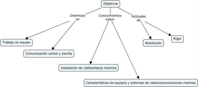 Este Cmap, tiene información relacionada con: Objetivos de la asignatura, Objetivos Conocimientos sobre Características de equipos y sistemas de radiocomunicaciones marinas, Objetivos Actitudes de Rigor, Objetivos Actitudes de Resolución, Objetivos Destrezas en Trabajo en equipo, Objetivos Destrezas en Comunicación verbal y escrita, Objetivos Conocimientos sobre Instalación de radioenlaces marinos