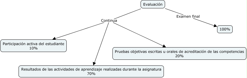 Este Cmap, tiene información relacionada con: Evaluación de la asignatura, Evaluación Continua Participación activa del estudiante 10%, Evaluación Examen final 100%, Evaluación Continua Pruebas objetivas escritas u orales de acreditación de las competencias 20%, Evaluación Continua Resultados de las actividades de aprendizaje realizadas durante la asignatura 70%