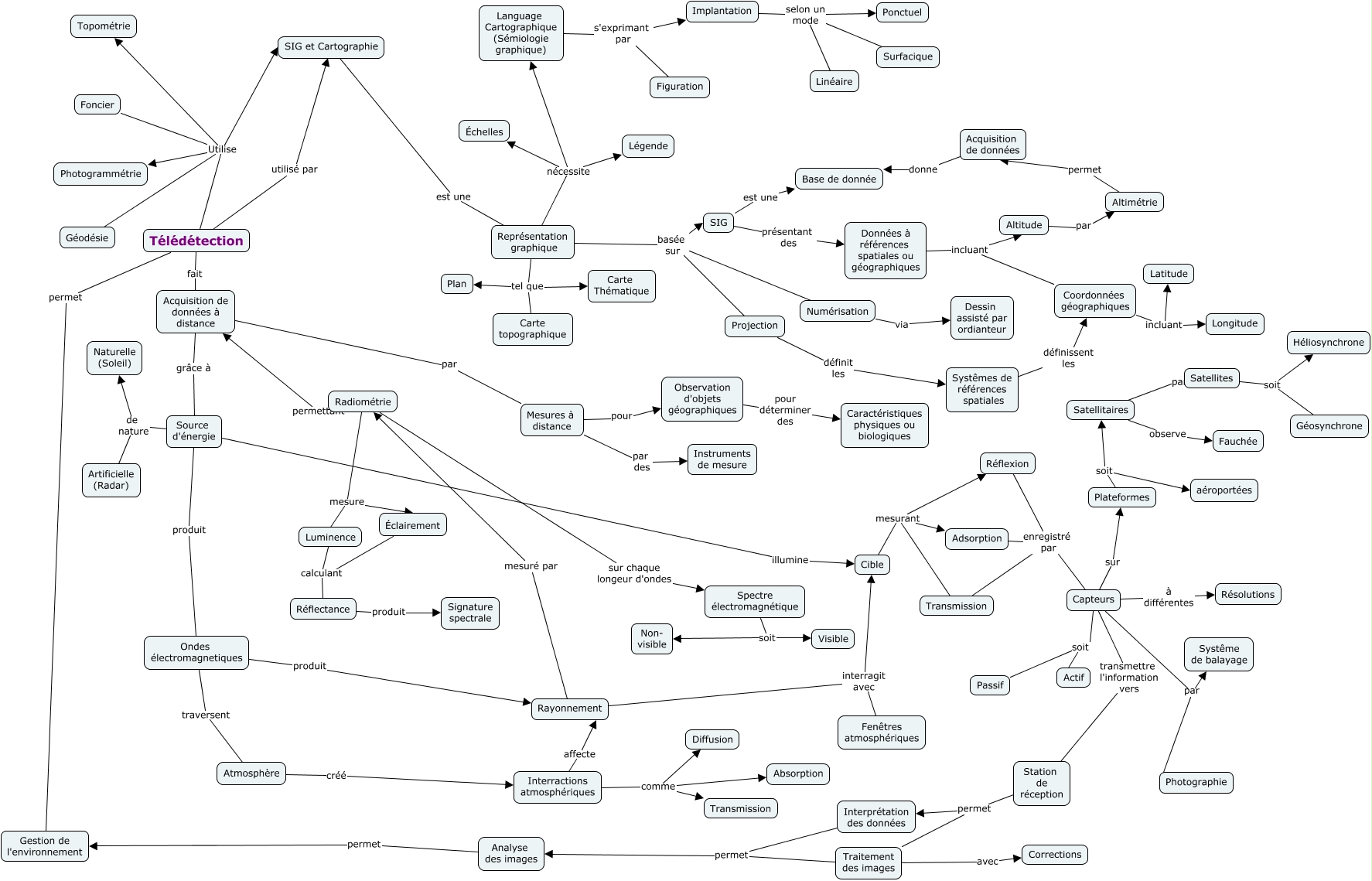 Cette carte de concepts créée avec IHMC CmapTools traite de: GéomatiqueTravail1, Altitude par Altimétrie, Télédétection fait Acquisition de données à distance, Spectre électromagnétique soit Visible, Traitement des images avec Corrections, Source d'énergie produit Ondes électromagnetiques, Données à références spatiales ou géographiques incluant Coordonnées géographiques, Rayonnement interragit avec Fenêtres atmosphériques, Cible mesurant Réflexion, Spectre électromagnétique soit Non- visible, Foncier Utilise SIG et Cartographie, Foncier Utilise Géodésie, Numérisation via Dessin assisté par ordianteur, Capteurs soit Passif, Capteurs à différentes Résolutions, SIG et Cartographie est une Représentation graphique, Station de réception permet Traitement des images, Représentation graphique nécessite Légende, Interprétation des données permet Analyse des images, Coordonnées géographiques incluant Longitude, Satellites soit Géosynchrone