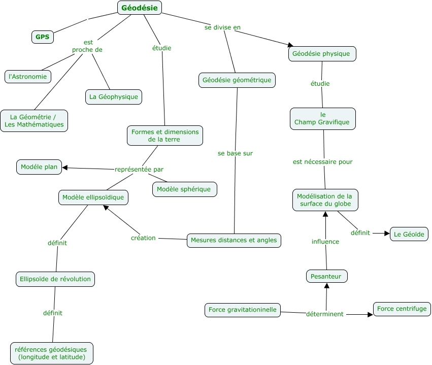 Cette carte de concepts créée avec IHMC CmapTools traite de: Géodésie, Géodésie GPS, Mesures distances et angles création Modèle ellipsoïdique, Formes et dimensions de la terre représentée par Modéle plan, Force gravitationinelle déterminent Pesanteur, Géodésie étudie Formes et dimensions de la terre, Géodésie se divise en Géodésie physique, Ellipsoïde de révolution définit références géodésiques (longitude et latitude), Géodésie physique étudie le Champ Gravifique, Géodésie est proche de La Géophysique, Pesanteur influence Modélisation de la surface du globe, Modélisation de la surface du globe définit Le Géoïde, Formes et dimensions de la terre représentée par Modèle sphérique, Modèle ellipsoïdique définit Ellipsoïde de révolution, Géodésie géométrique se base sur Mesures distances et angles, Géodésie est proche de l'Astronomie, le Champ Gravifique est nécessaire pour Modélisation de la surface du globe, Géodésie se divise en Géodésie géométrique, Force gravitationinelle déterminent Force centrifuge, Géodésie est proche de La Géométrie / Les Mathématiques, Formes et dimensions de la terre représentée par Modèle ellipsoïdique