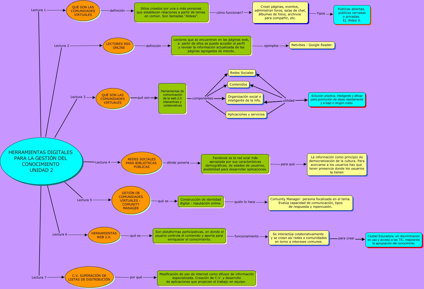 Este Cmap, tiene información relacionada con: HERRAMIENTAS DIGITALES UNIDAD 2, Construcción de identidad digital - reputación online. quién lo hace Comunity Manager: persona focalizada en el tema. Evalúa capacidad de comunicación, tipos de respuesta y repercusión., HERRAMIENTAS DIGITALES PARA LA GESTIÓN DEL CONOCIMIENTO UNIDAD 2 Lectura 7 C.V. SUPERACIÓN DE LISTAS DE DISTRIBUCIÓN, HERRAMIENTAS DIGITALES PARA LA GESTIÓN DEL CONOCIMIENTO UNIDAD 2 Lectura 6 HERRAMIENTAS WEB 2.0., C.V. SUPERACIÓN DE LISTAS DE DISTRIBUCIÓN por qué Masificación de uso de internet como difusor de información especializada. Creación de C.V. y desarrollo de aplicaciones que propicien el trabajo en equipo., Herramientas de comunicación de la web 2.0. interactivas y colaborativas componentes Organización social e inteligente de la info., Organización social e inteligente de la info. utilidad Redes Sociales, HERRAMIENTAS DIGITALES PARA LA GESTIÓN DEL CONOCIMIENTO UNIDAD 2 Lectura 5 GETIÓN DE COMUNIDADES VIRTUALES - COMUNITY MANAGER, Organización social e inteligente de la info. utilidad Contenidos, Sitios creados por una o más personas que establecen relaciones a partir de temas en común. Son llamadas "Aldeas". cómo funcionan? Crean páginas, eventos, administran foros, salas de chat, álbumes de fotos, archivos para compartir, etc., Lectores que se encuentran en las páginas web, a partir de ellos se puede acceder al perfil y revisar la información actualizada de las páginas agregadas de interés. ejemplos Netvibes - Google Reader., QUÉ SON LAS COMUNIDADES VIRTUALES qué son Herramientas de comunicación de la web 2.0. interactivas y colaborativas, Son plataformas participativas, en donde el usuario controla el contenido y aporta para enriquecer el conocimiento. funcionamiento Se interactúa colaborativamente y se crean así redes o comunidades en torno a intereses comunes., Crean páginas, eventos, administran foros, salas de chat, álbumes de fotos, archivos para compartir, etc. Tipos Públicas abiertas, públicas cerradas o privadas. Ej. Aldea X., REDES SOCIALES PARA BIBLIOTECAS PÚBLICAS dónde ponerla Facebook es la red scial más apropiada por sus características demográficas, de edades de usuarios, posibilidad para desarrollar aplicaciones., Herramientas de comunicación de la web 2.0. interactivas y colaborativas componentes Aplicaciones y servicios, HERRAMIENTAS DIGITALES PARA LA GESTIÓN DEL CONOCIMIENTO UNIDAD 2 Lectura 4 REDES SOCIALES PARA BIBLIOTECAS PÚBLICAS, GETIÓN DE COMUNIDADES VIRTUALES - COMUNITY MANAGER qué es Construcción de identidad digital - reputación online., LECTORES RSS ONLINE definición Lectores que se encuentran en las páginas web, a partir de ellos se puede acceder al perfil y revisar la información actualizada de las páginas agregadas de interés., Herramientas de comunicación de la web 2.0. interactivas y colaborativas componentes Contenidos, HERRAMIENTAS DIGITALES PARA LA GESTIÓN DEL CONOCIMIENTO UNIDAD 2 Lectura 1 QUÉ SON LAS COMUNIDADES VIRTUALES