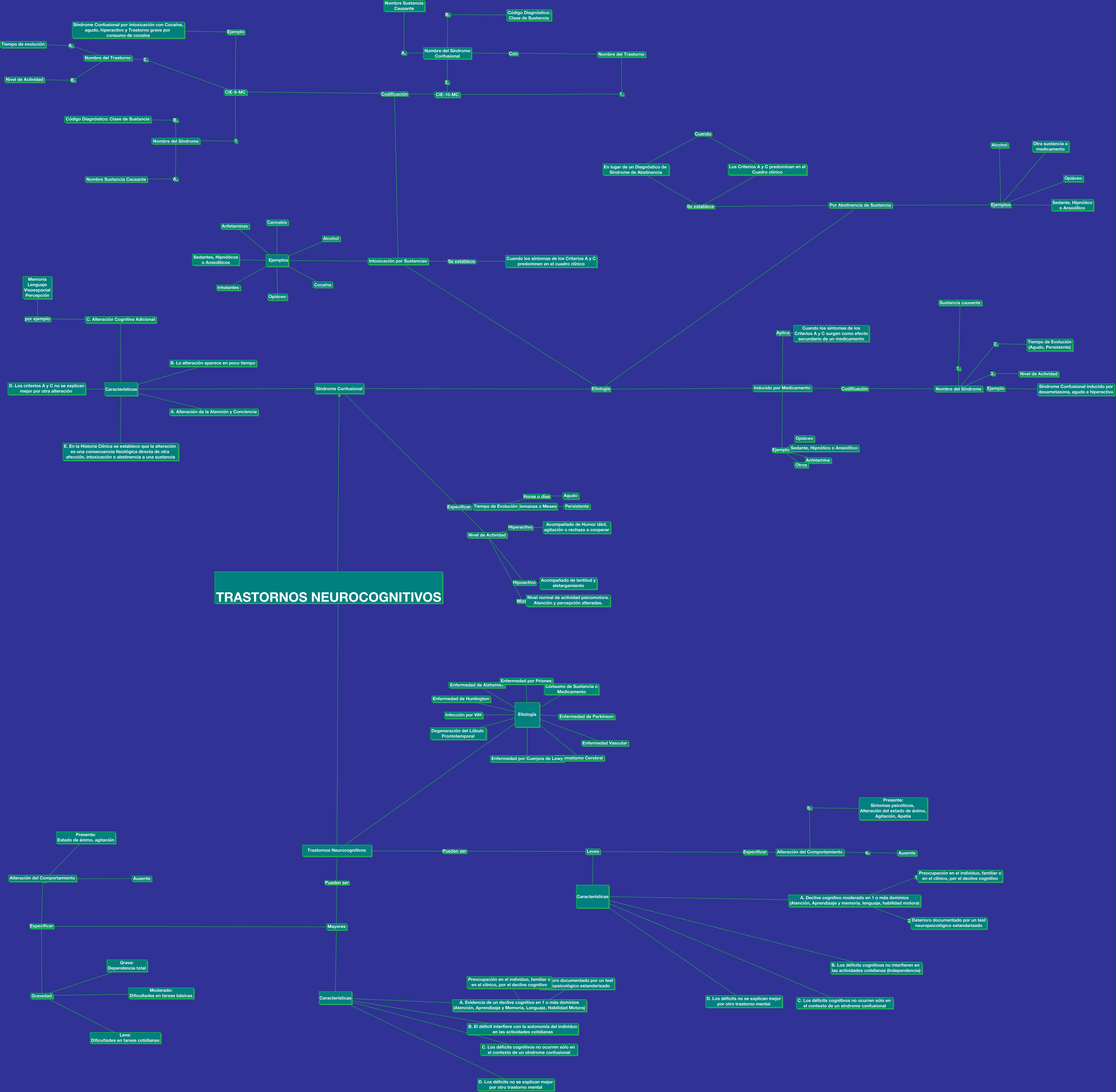 Este Cmap, tiene información relacionada con: Neurocognitivos TT, Nombre del Síndrome B. Código Diagnóstico: Clase de Sustancia, Intoxicación por Sustancias Codificación CIE-10-MC, A. Evidencia de un declive cognitivo en 1 o más dominios (Atención, Aprendizaje y Memoria, Lenguaje, Habilidad Motora) 2. Deterioro documentado por un test neuropsicológico estandarizado, TRASTORNOS NEUROCOGNITIVOS Incluye Síndrome Confusional, Nivel de Actividad Hiperactivo Acompañado de Humor lábil, agitación o rechazo a cooperar, Por Abstinencia de Sustancia Ejemplos Sedante, Hipnótico o Ansiolítico, Trastornos Neurocognitivos Pueden ser Leves, Nombre del Síndrome 3. Nivel de Actividad, Síndrome Confusional Características D. Los criterios A y C no se explican mejor por otra alteración, Nivel de Actividad Hipoactivo Acompañado de lentitud y aletargamiento, Síndrome Confusional Etiología Inducido por Medicamento, A. Declive cognitivo moderado en 1 o más dominios (Atención, Aprendizaje y memoria, lenguaje, habilidad motora) 2. Deterioro documentado por un test neuropsicológico estandarizado, Alteración del Comportamiento a. Ausente, Nombre del Síndrome Confusional A. Nombre Sustancia Causante, Trastornos Neurocognitivos Pueden ser Mayores, Nombre del Síndrome 2. Tiempo de Evolución (Agudo, Persistente), Por Abstinencia de Sustancia Se establece Los Criterios A y C predominan en el Cuadro clínico, Intoxicación por Sustancias Ejemplos Anfetaminas, TRASTORNOS NEUROCOGNITIVOS Incluye Trastornos Neurocognitivos, Leves Características C. Los déficits cognitivos no ocurren sólo en el contexto de un síndrome confusional