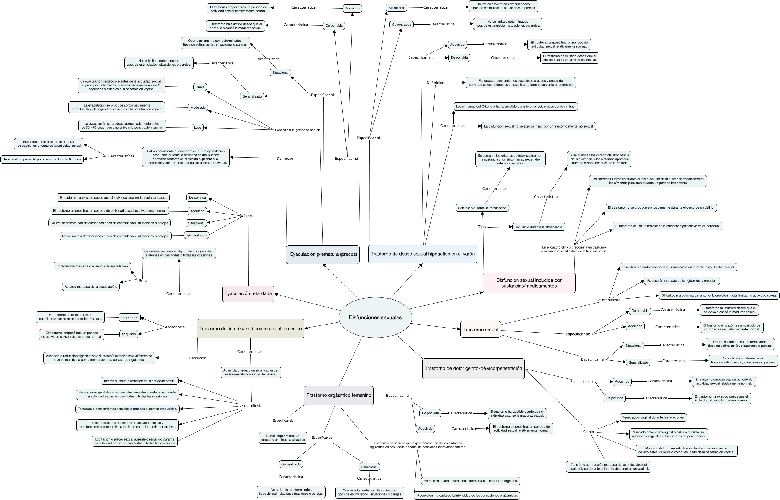 Este Cmap, tiene información relacionada con: Tema 13 disfunciones sexuales Gisselle Meneses gigi_meneses@hotmail.com, De por vida Caracteristica El trastorno ha existido desde que el individuo alcanzó la madurez sexual., Trastorno de dolor genito-pélvico/penetración Criterios Marcado dolor o ansiedad de sentir dolor vulvovaginal o pélvico antes, durante o como resultado de la penetración vaginal., Disfunciones sexuales ???? Trastorno de deseo sexual hipoactivo en el varón, Trastorno del interés/excitación sexual femenino Definición Ausencia o reducción significativa del interés/excitación sexual femenina, que se manifiesta por lo menos por una de las tres siguientes:, Patrón persistente o recurrente en que la eyaculación producida durante la actividad sexual sucede aproximadamente en el minuto siguiente a la penetración vaginal y antes de que lo desee el individuo. Caracteristícas Haber estado presente por lo menos durante 6 meses, Adquirido ???? El trastorno empezó tras un periodo de actividad sexual relativamente normal., Situacional Caracteristica Ocurre solamente con determinados tipos de estimulación, situaciones o parejas., Eyaculación prematura (precoz) Especificar si: De por vida, Se debe experimentar alguno de los siguientes síntomas en casi todas o todas las ocasiones Son: Infrecuencia marcada o ausencia de eyaculación., De por vida Caracteristica El trastorno ha existido desde que el individuo alcanzó la madurez sexual., Trastorno de deseo sexual hipoactivo en el varón Especificar si: De por vida, Trastorno eréctil Se manifiesta Dificultad marcada para conseguir una erección durante la ac- tividad sexual., Situacional ???? Ocurre solamente con determinados tipos de estimulación, situaciones o parejas, Moderado ???? La eyaculación se produce aproximadamente entre los 15 y 30 segundos siguientes a la penetración vaginal, De por vida Caracteristica El trastorno ha existido desde que el individuo alcanzó la madurez sexual., Trastorno de dolor genito-pélvico/penetración Criterios Tensión o contracción marcada de los músculos del suelo pélvico durante el intento de penetración vaginal., Disfunciones sexuales ???? Trastorno de dolor genito-pélvico/penetración, Adquirido ???? El trastorno empezó tras un periodo de actividad sexual relativamente normal., Adquirido Caracteristica El trastorno empezó tras un periodo de actividad sexual relativamente normal., Trastorno de dolor genito-pélvico/penetración Criterios Marcado dolor vulvovaginal o pélvico durante las relaciones vaginales o los intentos de penetración.
