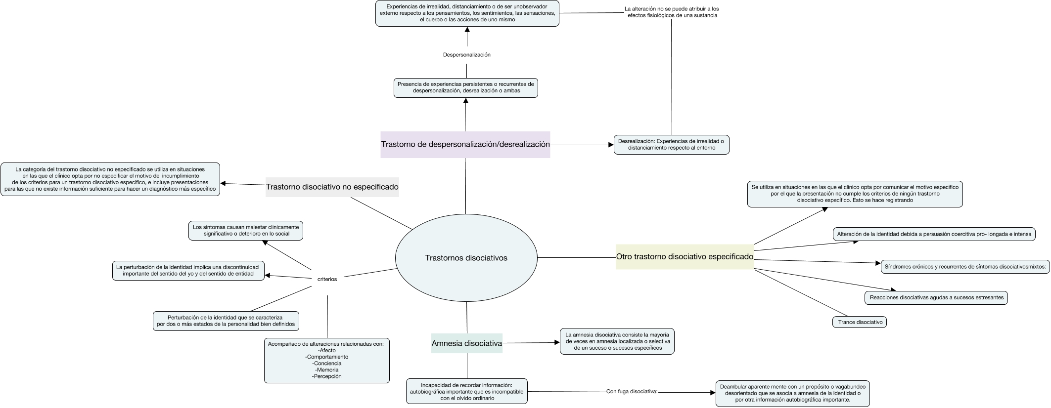 Este Cmap, tiene información relacionada con: tema 8 trastornos disociativos Gisselle Meneses gigi_meneses@hotmail.com, Trastornos disociativos Otro trastorno disociativo especificado Alteración de la identidad debida a persuasión coercitiva pro- longada e intensa, Trastornos disociativos Trastorno de despersonalización/desrealización Presencia de experiencias persistentes o recurrentes de despersonalización, desrealización o ambas, Trastornos disociativos Amnesia disociativa La amnesia disociativa consiste la mayoría de veces en amnesia localizada o selectiva de un suceso o sucesos específicos, Trastornos disociativos Otro trastorno disociativo especificado Síndromes crónicos y recurrentes de síntomas disociativos mixtos:, Incapacidad de recordar información: autobiográfica importante que es incompatible con el olvido ordinario Con fuga disociativa: Deambular aparente mente con un propósito o vagabundeo desorientado que se asocia a amnesia de la identidad o por otra información autobiográfica importante., Trastornos disociativos Trastorno de despersonalización/desrealización Desrealización: Experiencias de irrealidad o distanciamiento respecto al entorno, Trastornos disociativos Amnesia disociativa Incapacidad de recordar información: autobiográfica importante que es incompatible con el olvido ordinario, Trastornos disociativos Otro trastorno disociativo especificado Reacciones disociativas agudas a sucesos estresantes, Trastornos disociativos criterios Acompañado de alteraciones relacionadas con: -Afecto -Comportamiento -Conciencia -Memoria -Percepción, Trastornos disociativos Otro trastorno disociativo especificado Se utiliza en situaciones en las que el clínico opta por comunicar el motivo específico por el que la presentación no cumple los criterios de ningún trastorno disociativo específico. Esto se hace registrando, Trastornos disociativos criterios Perturbación de la identidad que se caracteriza por dos o más estados de la personalidad bien definidos, Trastornos disociativos criterios Los síntomas causan malestar clínicamente significativo o deterioro en lo social, Trastornos disociativos Trastorno disociativo no especificado La categoría del trastorno disociativo no especificado se utiliza en situaciones en las que el clínico opta por no especificar el motivo del incumplimiento de los criterios para un trastorno disociativo específico, e incluye presentaciones para las que no existe información suficiente para hacer un diagnóstico más específico, Trastornos disociativos criterios La perturbación de la identidad implica una discontinuidad importante del sentido del yo y del sentido de entidad, Experiencias de irrealidad, distanciamiento o de ser unobservador externo respecto a los pensamientos, los sentimientos, las sensaciones, el cuerpo o las acciones de uno mismo La alteración no se puede atribuir a los efectos fisiológicos de una sustancia Desrealización: Experiencias de irrealidad o distanciamiento respecto al entorno, Trastornos disociativos Otro trastorno disociativo especificado Trance disociativo, Presencia de experiencias persistentes o recurrentes de despersonalización, desrealización o ambas Despersonalización Experiencias de irrealidad, distanciamiento o de ser unobservador externo respecto a los pensamientos, los sentimientos, las sensaciones, el cuerpo o las acciones de uno mismo