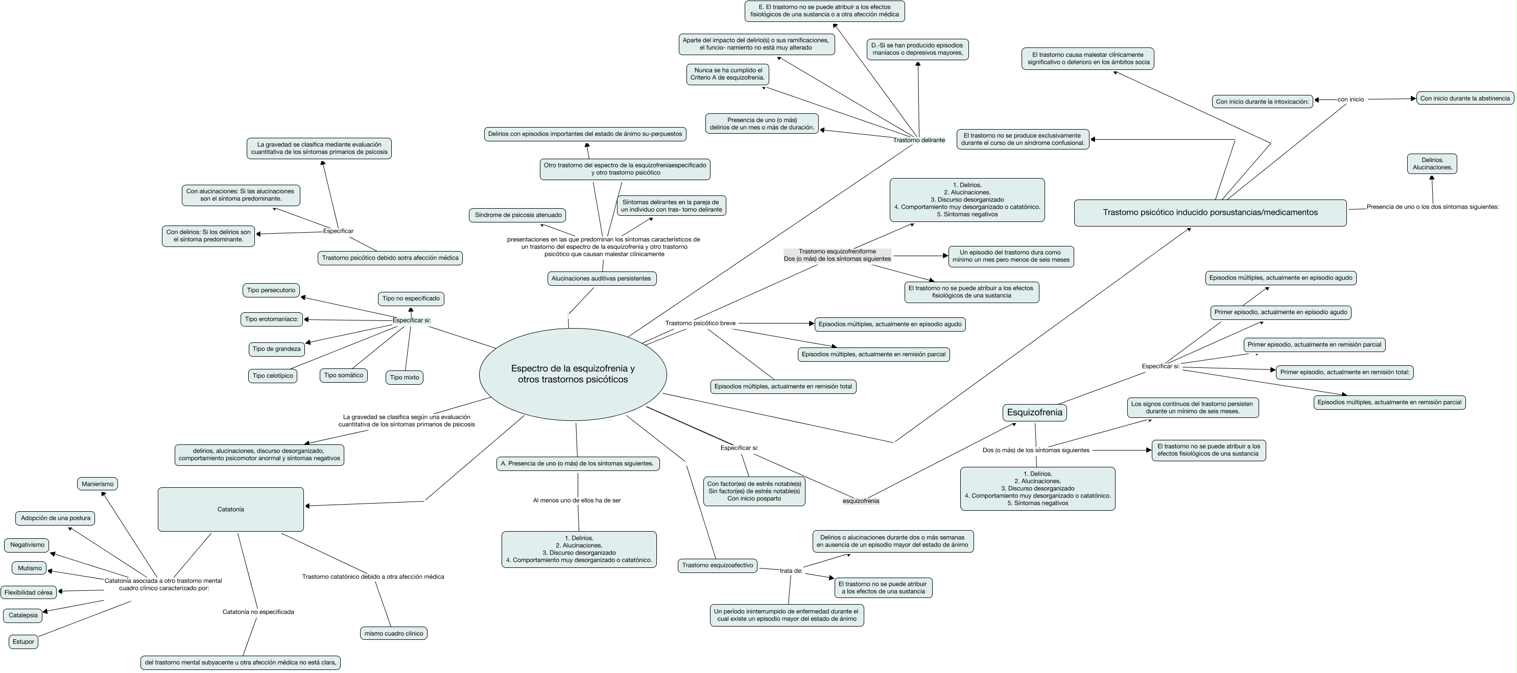 Este Cmap, tiene información relacionada con: tema 2 espectro de la ezquisofrenia Gisselle Meneses gigi_meneses@hotmail.com, Trastorno psicótico inducido por sustancias/medicamentos El trastorno causa malestar clínicamente significativo o deterioro en los ámbitos socia, Catatonía Catatonía asociada a otro trastorno mental cuadro clinico caracterizado por: Estupor, Espectro de la esquizofrenia y otros trastornos psicóticos La gravedad se clasifica según una evaluación cuantitativa de los síntomas primarios de psicosis delirios, alucinaciones, discurso desorganizado, comportamiento psicomotor anormal y síntomas negativos, Espectro de la esquizofrenia y otros trastornos psicóticos Trastorno delirante E. El trastorno no se puede atribuir a los efectos fisiológicos de una sustancia o a otra afección médica, Trastorno esquizoafectivo trata de: El trastorno no se puede atribuir a los efectos de una sustancia, Trastorno psicótico debido a otra afección médica Especificar Con alucinaciones: Si las alucinaciones son el síntoma predominante., Catatonía Catatonía asociada a otro trastorno mental cuadro clinico caracterizado por: Negativismo, Espectro de la esquizofrenia y otros trastornos psicóticos Especificar si: Tipo no especificado, Espectro de la esquizofrenia y otros trastornos psicóticos esquizofrenia Esquizofrenia, Espectro de la esquizofrenia y otros trastornos psicóticos Trastorno psicótico breve Episodios múltiples, actualmente en remisión parcial, Espectro de la esquizofrenia y otros trastornos psicóticos Trastorno delirante Nunca se ha cumplido el Criterio A de esquizofrenia., Otro trastorno del espectro de la esquizofrenia especificado y otro trastorno psicótico presentaciones en las que predominan los síntomas característicos de un trastorno del espectro de la esquizofrenia y otro trastorno psicótico que causan malestar clínicamente Síntomas delirantes en la pareja de un individuo con tras- torno delirante, Espectro de la esquizofrenia y otros trastornos psicóticos Trastorno esquizofreniforme Dos (o más) de los síntomas siguientes 1. Delirios. 2. Alucinaciones. 3. Discurso desorganizado 4. Comportamiento muy desorganizado o catatónico. 5. Síntomas negativos, Trastorno esquizoafectivo trata de: Un período ininterrumpido de enfermedad durante el cual existe un episodio mayor del estado de ánimo, Espectro de la esquizofrenia y otros trastornos psicóticos Trastorno delirante Aparte del impacto del delirio(s) o sus ramificaciones, el funcio- namiento no está muy alterado, Esquizofrenia Especificar si: Episodios múltiples, actualmente en remisión parcial, Espectro de la esquizofrenia y otros trastornos psicóticos Trastorno psicótico breve A. Presencia de uno (o más) de los síntomas siguientes., Espectro de la esquizofrenia y otros trastornos psicóticos Trastorno delirante D.-Si se han producido episodios maníacos o depresivos mayores,, Trastorno psicótico inducido por sustancias/medicamentos El trastorno no se produce exclusivamente durante el curso de un síndrome confusional., Esquizofrenia Especificar si: Primer episodio, actualmente en remisión parcial