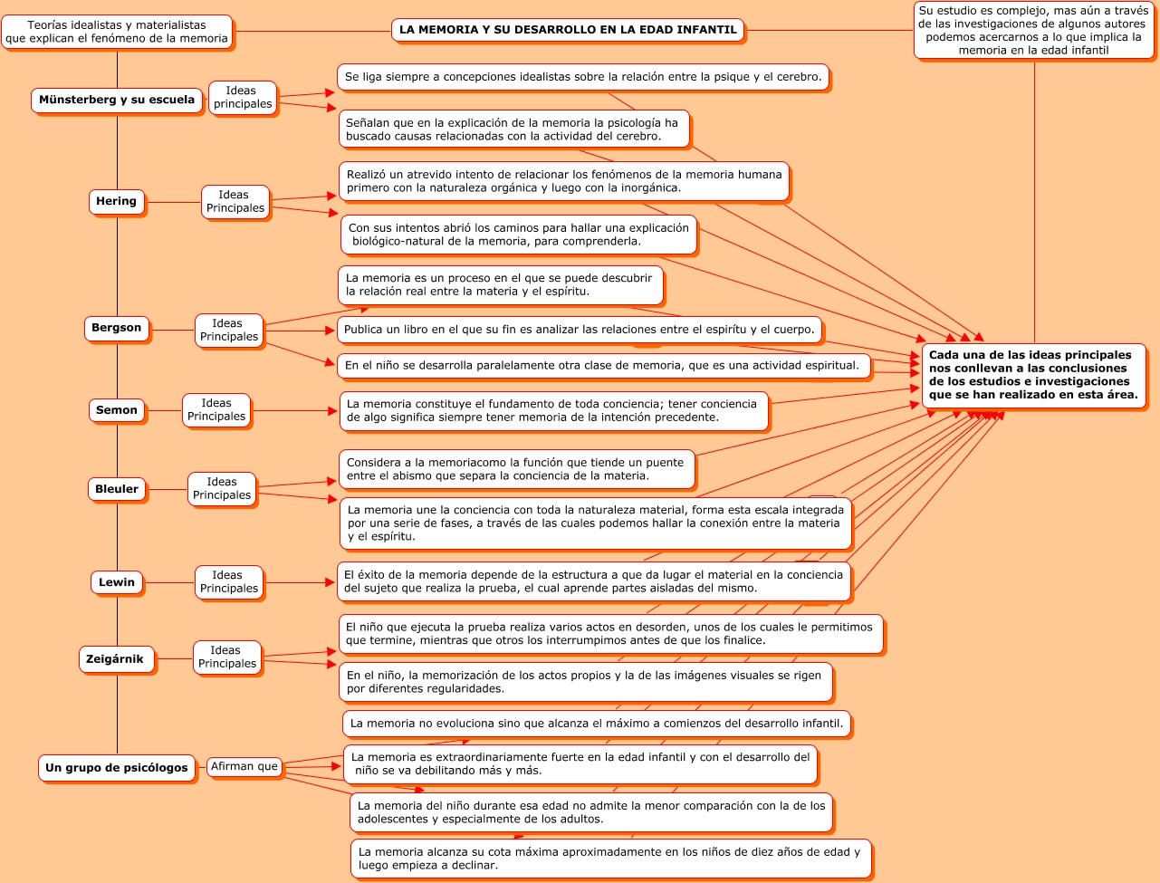 Este Cmap, tiene información relacionada con: Memoria-Edad Infantil, La memoria es extraordinariamente fuerte en la edad infantil y con el desarrollo del niño se va debilitando más y más. ???? Cada una de las ideas principales nos conllevan a las conclusiones de los estudios e investigaciones que se han realizado en esta área., El éxito de la memoria depende de la estructura a que da lugar el material en la conciencia del sujeto que realiza la prueba, el cual aprende partes aisladas del mismo. ???? Cada una de las ideas principales nos conllevan a las conclusiones de los estudios e investigaciones que se han realizado en esta área., LA MEMORIA Y SU DESARROLLO EN LA EDAD INFANTIL Teorías idealistas y materialistas que explican el fenómeno de la memoria Lewin, LA MEMORIA Y SU DESARROLLO EN LA EDAD INFANTIL Teorías idealistas y materialistas que explican el fenómeno de la memoria Bleuler, Un grupo de psicólogos Afirman que La memoria del niño durante esa edad no admite la menor comparación con la de los adolescentes y especialmente de los adultos., La memoria del niño durante esa edad no admite la menor comparación con la de los adolescentes y especialmente de los adultos. ???? Cada una de las ideas principales nos conllevan a las conclusiones de los estudios e investigaciones que se han realizado en esta área., Considera a la memoriacomo la función que tiende un puente entre el abismo que separa la conciencia de la materia. ???? Cada una de las ideas principales nos conllevan a las conclusiones de los estudios e investigaciones que se han realizado en esta área., Münsterberg y su escuela Ideas principales Se liga siempre a concepciones idealistas sobre la relación entre la psique y el cerebro., Realizó un atrevido intento de relacionar los fenómenos de la memoria humana primero con la naturaleza orgánica y luego con la inorgánica. ???? Cada una de las ideas principales nos conllevan a las conclusiones de los estudios e investigaciones que se han realizado en esta área., Publica un libro en el que su fin es analizar las relaciones entre el espirítu y el cuerpo. ???? Cada una de las ideas principales nos conllevan a las conclusiones de los estudios e investigaciones que se han realizado en esta área., Se liga siempre a concepciones idealistas sobre la relación entre la psique y el cerebro. ???? Cada una de las ideas principales nos conllevan a las conclusiones de los estudios e investigaciones que se han realizado en esta área., Zeigárnik Ideas Principales En el niño, la memorización de los actos propios y la de las imágenes visuales se rigen por diferentes regularidades., La memoria es un proceso en el que se puede descubrir la relación real entre la materia y el espíritu. ???? Cada una de las ideas principales nos conllevan a las conclusiones de los estudios e investigaciones que se han realizado en esta área., La memoria no evoluciona sino que alcanza el máximo a comienzos del desarrollo infantil. ???? Cada una de las ideas principales nos conllevan a las conclusiones de los estudios e investigaciones que se han realizado en esta área., LA MEMORIA Y SU DESARROLLO EN LA EDAD INFANTIL Teorías idealistas y materialistas que explican el fenómeno de la memoria Zeigárnik, Bergson Ideas Principales La memoria es un proceso en el que se puede descubrir la relación real entre la materia y el espíritu., Hering Ideas Principales Con sus intentos abrió los caminos para hallar una explicación biológico-natural de la memoria, para comprenderla., Hering Ideas Principales Realizó un atrevido intento de relacionar los fenómenos de la memoria humana primero con la naturaleza orgánica y luego con la inorgánica., La memoria constituye el fundamento de toda conciencia; tener conciencia de algo significa siempre tener memoria de la intención precedente. ???? Cada una de las ideas principales nos conllevan a las conclusiones de los estudios e investigaciones que se han realizado en esta área., Semon Ideas Principales La memoria constituye el fundamento de toda conciencia; tener conciencia de algo significa siempre tener memoria de la intención precedente.