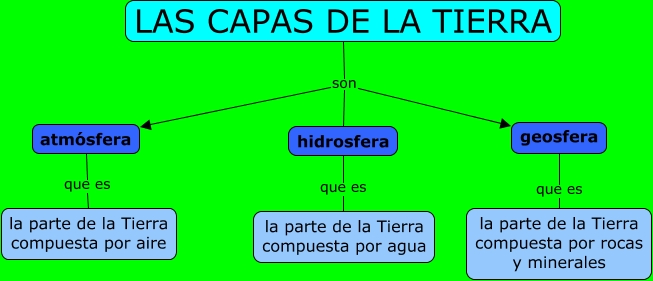 Este Cmap, tiene información relacionada con: Las capas de la Tierra, geosfera que es la parte de la Tierra compuesta por rocas y minerales, LAS CAPAS DE LA TIERRA son geosfera, atmósfera que es la parte de la Tierra compuesta por aire, LAS CAPAS DE LA TIERRA son atmósfera, hidrosfera que es la parte de la Tierra compuesta por agua, LAS CAPAS DE LA TIERRA son hidrosfera