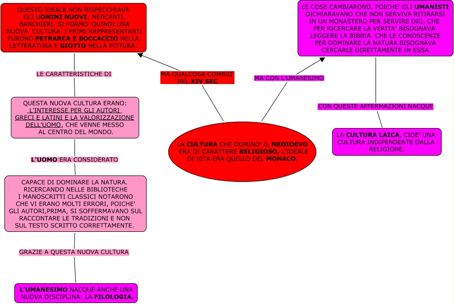 Questa Cmap, creata con IHMC CmapTools, contiene informazioni relative a: ORIGINI E CARATTERI DELL'UMANESIMO, LE COSE CAMBIARONO, POICHE' GLI UMANISTI DICHIARAVANO CHE NON SERVIVA RITIRARSI IN UN MONASTERO PER SERVIRE DIO, CHE PER RICERCARE LA VERITA' BISOGNAVA LEGGERE LA BIBBIA, CHE LE CONOSCENZE PER DOMINARE LA NATURA BISOGNAVA CERCARLE DIRETTAMENTE IN ESSA. CON QUESTE AFFERMAZIONI NACQUE LA CULTURA LAICA, CIOE' UNA CULTURA INDIPENDENTE DALLA RELIGIONE., LA CULTURA CHE DOMINO' IL MEDIOEVO ERA DI CARATTERE RELIGIOSO, L'IDEALE DI VITA ERA QUELLO DEL MONACO. MA QUALCOSA COMBIO' NEL XIV SEC QUESTO IDEALE NON RISPECCHIAVA GLI UOMINI NUOVI: MERCANTI, BANCHIERI. SI FORMO' QUINDI UNA NUOVA CULTURA. I PRIMI RAPPRESENTANTI FURONO PETRARCA E BOCCACCIO NELLA LETTERATURA E GIOTTO NELLA PITTURA., QUESTO IDEALE NON RISPECCHIAVA GLI UOMINI NUOVI: MERCANTI, BANCHIERI. SI FORMO' QUINDI UNA NUOVA CULTURA. I PRIMI RAPPRESENTANTI FURONO PETRARCA E BOCCACCIO NELLA LETTERATURA E GIOTTO NELLA PITTURA. LE CARATTERISTICHE DI QUESTA NUOVA CULTURA ERANO: L'INTERESSE PER GLI AUTORI GRECI E LATINI E LA VALORIZZAZIONE DELL'UOMO, CHE VENNE MESSO AL CENTRO DEL MONDO., CAPACE DI DOMINARE LA NATURA. RICERCANDO NELLE BIBLIOTECHE I MANOSCRITTI CLASSICI NOTARONO CHE VI ERANO MOLTI ERRORI, POICHE' GLI AUTORI,PRIMA, SI SOFFERMAVANO SUL RACCONTARE LE TRADIZIONI E NON SUL TESTO SCRITTO CORRETTAMENTE. GRAZIE A QUESTA NUOVA CULTURA L'UMANESIMO NACQUE ANCHE UNA NUOVA DISCIPLINA: LA FILOLOGIA., QUESTA NUOVA CULTURA ERANO: L'INTERESSE PER GLI AUTORI GRECI E LATINI E LA VALORIZZAZIONE DELL'UOMO, CHE VENNE MESSO AL CENTRO DEL MONDO. L'UOMO ERA CONSIDERATO CAPACE DI DOMINARE LA NATURA. RICERCANDO NELLE BIBLIOTECHE I MANOSCRITTI CLASSICI NOTARONO CHE VI ERANO MOLTI ERRORI, POICHE' GLI AUTORI,PRIMA, SI SOFFERMAVANO SUL RACCONTARE LE TRADIZIONI E NON SUL TESTO SCRITTO CORRETTAMENTE., LA CULTURA CHE DOMINO' IL MEDIOEVO ERA DI CARATTERE RELIGIOSO, L'IDEALE DI VITA ERA QUELLO DEL MONACO. MA CON L'UMANESIMO LE COSE CAMBIARONO, POICHE' GLI UMANISTI DICHIARAVANO CHE NON SERVIVA RITIRARSI IN UN MONASTERO PER SERVIRE DIO, CHE PER RICERCARE LA VERITA' BISOGNAVA LEGGERE LA BIBBIA, CHE LE CONOSCENZE PER DOMINARE LA NATURA BISOGNAVA CERCARLE DIRETTAMENTE IN ESSA.