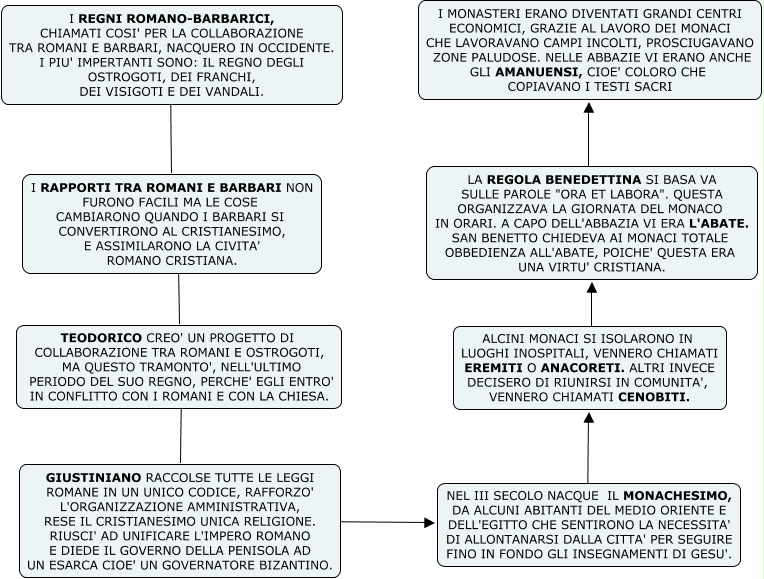 Questa Cmap, creata con IHMC CmapTools, contiene informazioni relative a: L'ESSENZIALE PAG 102, I REGNI ROMANO-BARBARICI, CHIAMATI COSI' PER LA COLLABORAZIONE TRA ROMANI E BARBARI, NACQUERO IN OCCIDENTE. I PIU' IMPERTANTI SONO: IL REGNO DEGLI OSTROGOTI, DEI FRANCHI, DEI VISIGOTI E DEI VANDALI. ???? I RAPPORTI TRA ROMANI E BARBARI NON FURONO FACILI MA LE COSE CAMBIARONO QUANDO I BARBARI SI CONVERTIRONO AL CRISTIANESIMO, E ASSIMILARONO LA CIVITA' ROMANO CRISTIANA., ALCINI MONACI SI ISOLARONO IN LUOGHI INOSPITALI, VENNERO CHIAMATI EREMITI O ANACORETI. ALTRI INVECE DECISERO DI RIUNIRSI IN COMUNITA', VENNERO CHIAMATI CENOBITI. ???? LA REGOLA BENEDETTINA SI BASA VA SULLE PAROLE "ORA ET LABORA". QUESTA ORGANIZZAVA LA GIORNATA DEL MONACO IN ORARI. A CAPO DELL'ABBAZIA VI ERA L'ABATE. SAN BENETTO CHIEDEVA AI MONACI TOTALE OBBEDIENZA ALL'ABATE, POICHE' QUESTA ERA UNA VIRTU' CRISTIANA., NEL III SECOLO NACQUE IL MONACHESIMO, DA ALCUNI ABITANTI DEL MEDIO ORIENTE E DELL'EGITTO CHE SENTIRONO LA NECESSITA' DI ALLONTANARSI DALLA CITTA' PER SEGUIRE FINO IN FONDO GLI INSEGNAMENTI DI GESU'. ???? ALCINI MONACI SI ISOLARONO IN LUOGHI INOSPITALI, VENNERO CHIAMATI EREMITI O ANACORETI. ALTRI INVECE DECISERO DI RIUNIRSI IN COMUNITA', VENNERO CHIAMATI CENOBITI., I RAPPORTI TRA ROMANI E BARBARI NON FURONO FACILI MA LE COSE CAMBIARONO QUANDO I BARBARI SI CONVERTIRONO AL CRISTIANESIMO, E ASSIMILARONO LA CIVITA' ROMANO CRISTIANA. ???? TEODORICO CREO' UN PROGETTO DI COLLABORAZIONE TRA ROMANI E OSTROGOTI, MA QUESTO TRAMONTO', NELL'ULTIMO PERIODO DEL SUO REGNO, PERCHE' EGLI ENTRO' IN CONFLITTO CON I ROMANI E CON LA CHIESA., GIUSTINIANO RACCOLSE TUTTE LE LEGGI ROMANE IN UN UNICO CODICE, RAFFORZO' L'ORGANIZZAZIONE AMMINISTRATIVA, RESE IL CRISTIANESIMO UNICA RELIGIONE. RIUSCI' AD UNIFICARE L'IMPERO ROMANO E DIEDE IL GOVERNO DELLA PENISOLA AD UN ESARCA CIOE' UN GOVERNATORE BIZANTINO. ???? NEL III SECOLO NACQUE IL MONACHESIMO, DA ALCUNI ABITANTI DEL MEDIO ORIENTE E DELL'EGITTO CHE SENTIRONO LA NECESSITA' DI ALLONTANARSI DALLA CITTA' PER SEGUIRE FINO IN FONDO GLI INSEGNAMENTI DI GESU'., TEODORICO CREO' UN PROGETTO DI COLLABORAZIONE TRA ROMANI E OSTROGOTI, MA QUESTO TRAMONTO', NELL'ULTIMO PERIODO DEL SUO REGNO, PERCHE' EGLI ENTRO' IN CONFLITTO CON I ROMANI E CON LA CHIESA. ???? GIUSTINIANO RACCOLSE TUTTE LE LEGGI ROMANE IN UN UNICO CODICE, RAFFORZO' L'ORGANIZZAZIONE AMMINISTRATIVA, RESE IL CRISTIANESIMO UNICA RELIGIONE. RIUSCI' AD UNIFICARE L'IMPERO ROMANO E DIEDE IL GOVERNO DELLA PENISOLA AD UN ESARCA CIOE' UN GOVERNATORE BIZANTINO., LA REGOLA BENEDETTINA SI BASA VA SULLE PAROLE "ORA ET LABORA". QUESTA ORGANIZZAVA LA GIORNATA DEL MONACO IN ORARI. A CAPO DELL'ABBAZIA VI ERA L'ABATE. SAN BENETTO CHIEDEVA AI MONACI TOTALE OBBEDIENZA ALL'ABATE, POICHE' QUESTA ERA UNA VIRTU' CRISTIANA. ???? I MONASTERI ERANO DIVENTATI GRANDI CENTRI ECONOMICI, GRAZIE AL LAVORO DEI MONACI CHE LAVORAVANO CAMPI INCOLTI, PROSCIUGAVANO ZONE PALUDOSE. NELLE ABBAZIE VI ERANO ANCHE GLI AMANUENSI, CIOE' COLORO CHE COPIAVANO I TESTI SACRI