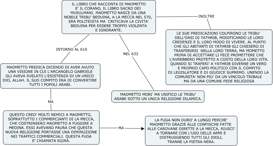 Questa Cmap, creata con IHMC CmapTools, contiene informazioni relative a: MAOMETTO E L'UNITA' DEL POPOLO ARABO, IL LIBRO CHE RACCONTA DI MAOMETTO E' IL CORANO, IL LIBRO SACRO DEI MUSULMANI. MAOMETTO NASCE DA UNA NOBILE TRIBU' BEDUINA, A LA MECCA NEL 570, ERA POLITEISTA MA CRITICAVA LA CIVITA' BEDUINA PER ESSERE TROPPO VIOLENTA E IGNORANTE. INTORNO AL 610 MAOMETTO PREDICA DICENDO DI AVER AVUTO UNA VISIONE IN CUI L'ARCANGELO GABRIELE GLI AVEVA SVELATO L'ESISTENZA DI UN UNICO DIO, ALLAH. IL SUO COMPITO ERA DI CONVERTIRE TUTTI I POPOLI ARABI., IL LIBRO CHE RACCONTA DI MAOMETTO E' IL CORANO, IL LIBRO SACRO DEI MUSULMANI. MAOMETTO NASCE DA UNA NOBILE TRIBU' BEDUINA, A LA MECCA NEL 570, ERA POLITEISTA MA CRITICAVA LA CIVITA' BEDUINA PER ESSERE TROPPO VIOLENTA E IGNORANTE. NEL 632 MAOMETTO MORI' MA UNIFICO LE TRIBU' ARABE SOTTO UN UNICA RELIGIONE ISLAMICA., MAOMETTO PREDICA DICENDO DI AVER AVUTO UNA VISIONE IN CUI L'ARCANGELO GABRIELE GLI AVEVA SVELATO L'ESISTENZA DI UN UNICO DIO, ALLAH. IL SUO COMPITO ERA DI CONVERTIRE TUTTI I POPOLI ARABI. MA QUESTO CREO' MOLTI NEMICI A MAOMETTO, SOPRATTUTTO I COMMERCIANTI DI LA MECCA, CHE COSTRINSERO MAOMETTO A FUGGIRE A MEDINA. ESSI AVEVANO PAURA CHE QUESTA NUOVA RELIGIONE PORTASSE UNA DIMINUZIONE NEI TRAFFICI COMMERCIALI. QUESTA FUGA E' CHIAMATA EGIRA., IL LIBRO CHE RACCONTA DI MAOMETTO E' IL CORANO, IL LIBRO SACRO DEI MUSULMANI. MAOMETTO NASCE DA UNA NOBILE TRIBU' BEDUINA, A LA MECCA NEL 570, ERA POLITEISTA MA CRITICAVA LA CIVITA' BEDUINA PER ESSERE TROPPO VIOLENTA E IGNORANTE. INOLTRE LE SUE PREDICAZIONI COLPIRONO LE TRIBU' DELL'OASI DI YATHRIB, MODIFICANDO LE LORO CREDENZE E IL LORO MODO DI VIVERE. AL PUNTO CHE GLI ABITANTI DI YATHRIB GLI CHIESERO DI TRASFERIRSI NELLA LORO TERRA, MA MOMETTO PRIMA DI ACCETTARE LI FECE PROMETTERE CHE L'AVREBBERO PROTETTO A COSTO DELLA LORO VITA. QUANDO SI TRAFERI' A YATHRIB DIVENNE UN VERO E PROPRIO CAPO POLITICO CON IL COMPITO DI LEGISLATORE E DI GIUDICE SUPREMO. UNENDO LA COMUNITA' NON PIU' DA UN VINCOLO TRIBALE MA DA UNA COMUNE FEDE RELIGIOSA, QUESTO CREO' MOLTI NEMICI A MAOMETTO, SOPRATTUTTO I COMMERCIANTI DI LA MECCA, CHE COSTRINSERO MAOMETTO A FUGGIRE A MEDINA. ESSI AVEVANO PAURA CHE QUESTA NUOVA RELIGIONE PORTASSE UNA DIMINUZIONE NEI TRAFFICI COMMERCIALI. QUESTA FUGA E' CHIAMATA EGIRA. MA LA FUGA NON DURO' A LUNGO PERCHE' MAOMETTO GRAZIE ALLE CONFISCHE FATTE ALLE CAROVANE DIRETTE A LA MECCA, RIUSCI' A TORNARE CON L'USO DELLE ARMI E DISTRUGGENDO TUTTI GLI IDOLI, TRANNE LA PIETRA NERA.