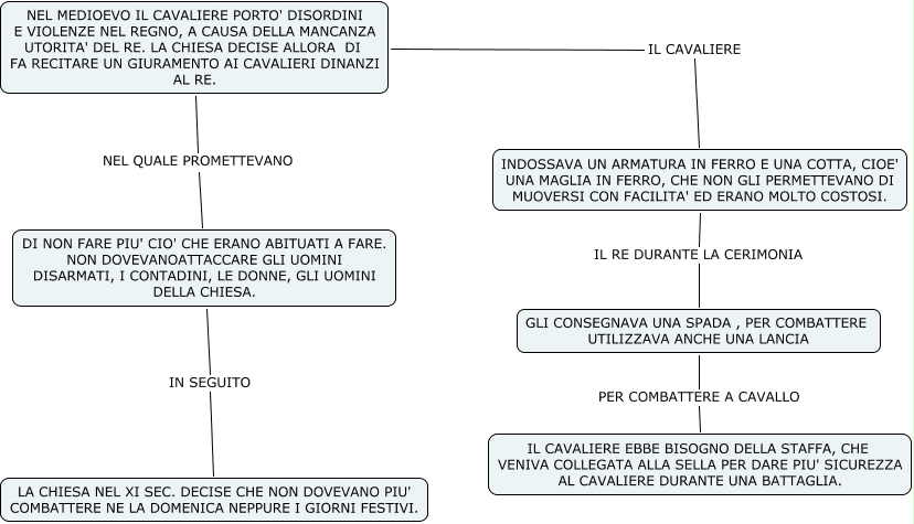 Questa Cmap, creata con IHMC CmapTools, contiene informazioni relative a: DA PREDONI A CAVALIERI, NEL MEDIOEVO IL CAVALIERE PORTO' DISORDINI E VIOLENZE NEL REGNO, A CAUSA DELLA MANCANZA UTORITA' DEL RE. LA CHIESA DECISE ALLORA DI FA RECITARE UN GIURAMENTO AI CAVALIERI DINANZI AL RE. NEL QUALE PROMETTEVANO DI NON FARE PIU' CIO' CHE ERANO ABITUATI A FARE. NON DOVEVANOATTACCARE GLI UOMINI DISARMATI, I CONTADINI, LE DONNE, GLI UOMINI DELLA CHIESA., DI NON FARE PIU' CIO' CHE ERANO ABITUATI A FARE. NON DOVEVANOATTACCARE GLI UOMINI DISARMATI, I CONTADINI, LE DONNE, GLI UOMINI DELLA CHIESA. IN SEGUITO LA CHIESA NEL XI SEC. DECISE CHE NON DOVEVANO PIU' COMBATTERE NE LA DOMENICA NEPPURE I GIORNI FESTIVI., INDOSSAVA UN ARMATURA IN FERRO E UNA COTTA, CIOE' UNA MAGLIA IN FERRO, CHE NON GLI PERMETTEVANO DI MUOVERSI CON FACILITA' ED ERANO MOLTO COSTOSI. IL RE DURANTE LA CERIMONIA GLI CONSEGNAVA UNA SPADA , PER COMBATTERE UTILIZZAVA ANCHE UNA LANCIA, NEL MEDIOEVO IL CAVALIERE PORTO' DISORDINI E VIOLENZE NEL REGNO, A CAUSA DELLA MANCANZA UTORITA' DEL RE. LA CHIESA DECISE ALLORA DI FA RECITARE UN GIURAMENTO AI CAVALIERI DINANZI AL RE. IL CAVALIERE INDOSSAVA UN ARMATURA IN FERRO E UNA COTTA, CIOE' UNA MAGLIA IN FERRO, CHE NON GLI PERMETTEVANO DI MUOVERSI CON FACILITA' ED ERANO MOLTO COSTOSI., GLI CONSEGNAVA UNA SPADA , PER COMBATTERE UTILIZZAVA ANCHE UNA LANCIA PER COMBATTERE A CAVALLO IL CAVALIERE EBBE BISOGNO DELLA STAFFA, CHE VENIVA COLLEGATA ALLA SELLA PER DARE PIU' SICUREZZA AL CAVALIERE DURANTE UNA BATTAGLIA.