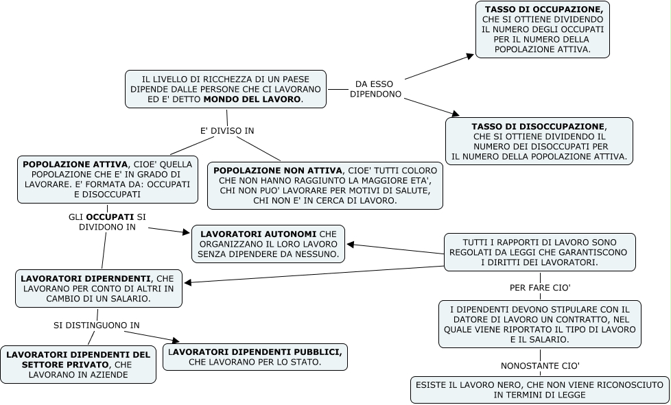 Questa Cmap, creata con IHMC CmapTools, contiene informazioni relative a: IL MONDO DEL LAVORO, LAVORATORI DIPERNDENTI, CHE LAVORANO PER CONTO DI ALTRI IN CAMBIO DI UN SALARIO. SI DISTINGUONO IN LAVORATORI DIPENDENTI DEL SETTORE PRIVATO, CHE LAVORANO IN AZIENDE, IL LIVELLO DI RICCHEZZA DI UN PAESE DIPENDE DALLE PERSONE CHE CI LAVORANO ED E' DETTO MONDO DEL LAVORO. E' DIVISO IN POPOLAZIONE NON ATTIVA, CIOE' TUTTI COLORO CHE NON HANNO RAGGIUNTO LA MAGGIORE ETA', CHI NON PUO' LAVORARE PER MOTIVI DI SALUTE, CHI NON E' IN CERCA DI LAVORO., I DIPENDENTI DEVONO STIPULARE CON IL DATORE DI LAVORO UN CONTRATTO, NEL QUALE VIENE RIPORTATO IL TIPO DI LAVORO E IL SALARIO. NONOSTANTE CIO' ESISTE IL LAVORO NERO, CHE NON VIENE RICONOSCIUTO IN TERMINI DI LEGGE, POPOLAZIONE ATTIVA, CIOE' QUELLA POPOLAZIONE CHE E' IN GRADO DI LAVORARE. E' FORMATA DA: OCCUPATI E DISOCCUPATI GLI OCCUPATI SI DIVIDONO IN LAVORATORI AUTONOMI CHE ORGANIZZANO IL LORO LAVORO SENZA DIPENDERE DA NESSUNO., TUTTI I RAPPORTI DI LAVORO SONO REGOLATI DA LEGGI CHE GARANTISCONO I DIRITTI DEI LAVORATORI. ???? LAVORATORI AUTONOMI CHE ORGANIZZANO IL LORO LAVORO SENZA DIPENDERE DA NESSUNO., IL LIVELLO DI RICCHEZZA DI UN PAESE DIPENDE DALLE PERSONE CHE CI LAVORANO ED E' DETTO MONDO DEL LAVORO. E' DIVISO IN POPOLAZIONE ATTIVA, CIOE' QUELLA POPOLAZIONE CHE E' IN GRADO DI LAVORARE. E' FORMATA DA: OCCUPATI E DISOCCUPATI, IL LIVELLO DI RICCHEZZA DI UN PAESE DIPENDE DALLE PERSONE CHE CI LAVORANO ED E' DETTO MONDO DEL LAVORO. DA ESSO DIPENDONO TASSO DI OCCUPAZIONE, CHE SI OTTIENE DIVIDENDO IL NUMERO DEGLI OCCUPATI PER IL NUMERO DELLA POPOLAZIONE ATTIVA., POPOLAZIONE ATTIVA, CIOE' QUELLA POPOLAZIONE CHE E' IN GRADO DI LAVORARE. E' FORMATA DA: OCCUPATI E DISOCCUPATI GLI OCCUPATI SI DIVIDONO IN LAVORATORI DIPERNDENTI, CHE LAVORANO PER CONTO DI ALTRI IN CAMBIO DI UN SALARIO., TUTTI I RAPPORTI DI LAVORO SONO REGOLATI DA LEGGI CHE GARANTISCONO I DIRITTI DEI LAVORATORI. PER FARE CIO' I DIPENDENTI DEVONO STIPULARE CON IL DATORE DI LAVORO UN CONTRATTO, NEL QUALE VIENE RIPORTATO IL TIPO DI LAVORO E IL SALARIO., TUTTI I RAPPORTI DI LAVORO SONO REGOLATI DA LEGGI CHE GARANTISCONO I DIRITTI DEI LAVORATORI. ???? LAVORATORI DIPERNDENTI, CHE LAVORANO PER CONTO DI ALTRI IN CAMBIO DI UN SALARIO., LAVORATORI DIPERNDENTI, CHE LAVORANO PER CONTO DI ALTRI IN CAMBIO DI UN SALARIO. SI DISTINGUONO IN LAVORATORI DIPENDENTI PUBBLICI, CHE LAVORANO PER LO STATO., IL LIVELLO DI RICCHEZZA DI UN PAESE DIPENDE DALLE PERSONE CHE CI LAVORANO ED E' DETTO MONDO DEL LAVORO. DA ESSO DIPENDONO TASSO DI DISOCCUPAZIONE, CHE SI OTTIENE DIVIDENDO IL NUMERO DEI DISOCCUPATI PER IL NUMERO DELLA POPOLAZIONE ATTIVA.