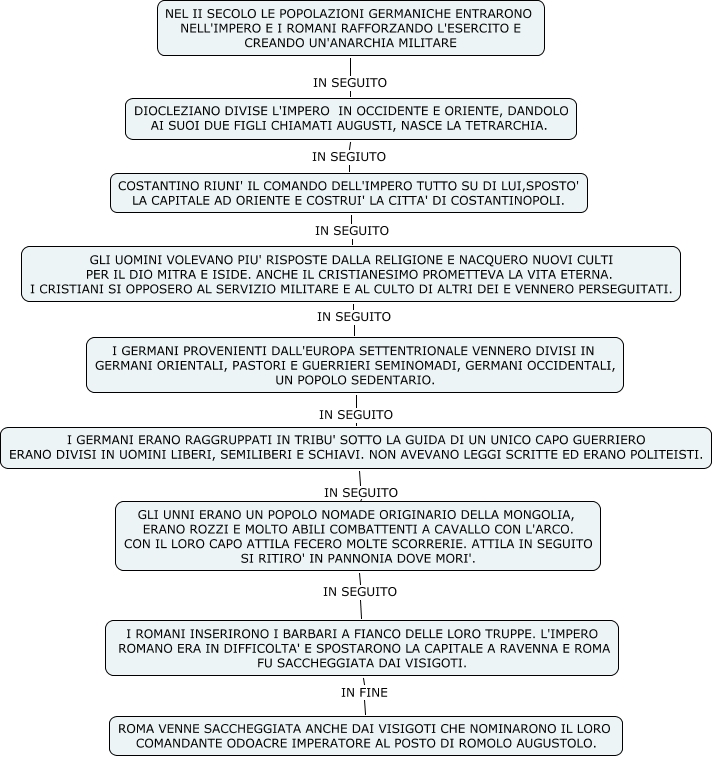 Questa Cmap, creata con IHMC CmapTools, contiene informazioni relative a: L'ESSENZIALE DEL CAP 1 DI STORIA, I GERMANI PROVENIENTI DALL'EUROPA SETTENTRIONALE VENNERO DIVISI IN GERMANI ORIENTALI, PASTORI E GUERRIERI SEMINOMADI, GERMANI OCCIDENTALI, UN POPOLO SEDENTARIO. IN SEGUITO I GERMANI ERANO RAGGRUPPATI IN TRIBU' SOTTO LA GUIDA DI UN UNICO CAPO GUERRIERO ERANO DIVISI IN UOMINI LIBERI, SEMILIBERI E SCHIAVI. NON AVEVANO LEGGI SCRITTE ED ERANO POLITEISTI., GLI UNNI ERANO UN POPOLO NOMADE ORIGINARIO DELLA MONGOLIA, ERANO ROZZI E MOLTO ABILI COMBATTENTI A CAVALLO CON L'ARCO. CON IL LORO CAPO ATTILA FECERO MOLTE SCORRERIE. ATTILA IN SEGUITO SI RITIRO' IN PANNONIA DOVE MORI'. IN SEGUITO I ROMANI INSERIRONO I BARBARI A FIANCO DELLE LORO TRUPPE. L'IMPERO ROMANO ERA IN DIFFICOLTA' E SPOSTARONO LA CAPITALE A RAVENNA E ROMA FU SACCHEGGIATA DAI VISIGOTI., NEL II SECOLO LE POPOLAZIONI GERMANICHE ENTRARONO NELL'IMPERO E I ROMANI RAFFORZANDO L'ESERCITO E CREANDO UN'ANARCHIA MILITARE IN SEGUITO DIOCLEZIANO DIVISE L'IMPERO IN OCCIDENTE E ORIENTE, DANDOLO AI SUOI DUE FIGLI CHIAMATI AUGUSTI, NASCE LA TETRARCHIA., DIOCLEZIANO DIVISE L'IMPERO IN OCCIDENTE E ORIENTE, DANDOLO AI SUOI DUE FIGLI CHIAMATI AUGUSTI, NASCE LA TETRARCHIA. IN SEGIUTO COSTANTINO RIUNI' IL COMANDO DELL'IMPERO TUTTO SU DI LUI,SPOSTO' LA CAPITALE AD ORIENTE E COSTRUI' LA CITTA' DI COSTANTINOPOLI., I ROMANI INSERIRONO I BARBARI A FIANCO DELLE LORO TRUPPE. L'IMPERO ROMANO ERA IN DIFFICOLTA' E SPOSTARONO LA CAPITALE A RAVENNA E ROMA FU SACCHEGGIATA DAI VISIGOTI. IN FINE ROMA VENNE SACCHEGGIATA ANCHE DAI VISIGOTI CHE NOMINARONO IL LORO COMANDANTE ODOACRE IMPERATORE AL POSTO DI ROMOLO AUGUSTOLO., I GERMANI ERANO RAGGRUPPATI IN TRIBU' SOTTO LA GUIDA DI UN UNICO CAPO GUERRIERO ERANO DIVISI IN UOMINI LIBERI, SEMILIBERI E SCHIAVI. NON AVEVANO LEGGI SCRITTE ED ERANO POLITEISTI. IN SEGUITO GLI UNNI ERANO UN POPOLO NOMADE ORIGINARIO DELLA MONGOLIA, ERANO ROZZI E MOLTO ABILI COMBATTENTI A CAVALLO CON L'ARCO. CON IL LORO CAPO ATTILA FECERO MOLTE SCORRERIE. ATTILA IN SEGUITO SI RITIRO' IN PANNONIA DOVE MORI'., GLI UOMINI VOLEVANO PIU' RISPOSTE DALLA RELIGIONE E NACQUERO NUOVI CULTI PER IL DIO MITRA E ISIDE. ANCHE IL CRISTIANESIMO PROMETTEVA LA VITA ETERNA. I CRISTIANI SI OPPOSERO AL SERVIZIO MILITARE E AL CULTO DI ALTRI DEI E VENNERO PERSEGUITATI. IN SEGUITO I GERMANI PROVENIENTI DALL'EUROPA SETTENTRIONALE VENNERO DIVISI IN GERMANI ORIENTALI, PASTORI E GUERRIERI SEMINOMADI, GERMANI OCCIDENTALI, UN POPOLO SEDENTARIO., COSTANTINO RIUNI' IL COMANDO DELL'IMPERO TUTTO SU DI LUI,SPOSTO' LA CAPITALE AD ORIENTE E COSTRUI' LA CITTA' DI COSTANTINOPOLI. IN SEGUITO GLI UOMINI VOLEVANO PIU' RISPOSTE DALLA RELIGIONE E NACQUERO NUOVI CULTI PER IL DIO MITRA E ISIDE. ANCHE IL CRISTIANESIMO PROMETTEVA LA VITA ETERNA. I CRISTIANI SI OPPOSERO AL SERVIZIO MILITARE E AL CULTO DI ALTRI DEI E VENNERO PERSEGUITATI.