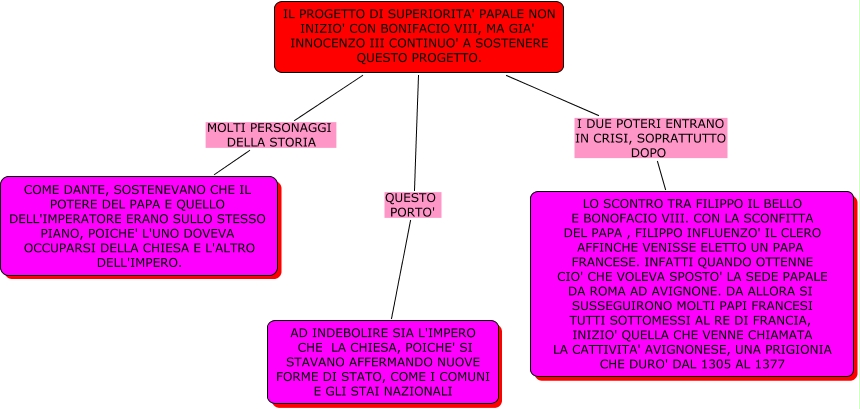 Questa Cmap, creata con IHMC CmapTools, contiene informazioni relative a: LA SUPERIORITA' DEL PAPATO, IL PROGETTO DI SUPERIORITA' PAPALE NON INIZIO' CON BONIFACIO VIII, MA GIA' INNOCENZO III CONTINUO' A SOSTENERE QUESTO PROGETTO. I DUE POTERI ENTRANO IN CRISI, SOPRATTUTTO DOPO LO SCONTRO TRA FILIPPO IL BELLO E BONOFACIO VIII. CON LA SCONFITTA DEL PAPA , FILIPPO INFLUENZO' IL CLERO AFFINCHE VENISSE ELETTO UN PAPA FRANCESE. INFATTI QUANDO OTTENNE CIO' CHE VOLEVA SPOSTO' LA SEDE PAPALE DA ROMA AD AVIGNONE. DA ALLORA SI SUSSEGUIRONO MOLTI PAPI FRANCESI TUTTI SOTTOMESSI AL RE DI FRANCIA, INIZIO' QUELLA CHE VENNE CHIAMATA LA CATTIVITA' AVIGNONESE, UNA PRIGIONIA CHE DURO' DAL 1305 AL 1377, IL PROGETTO DI SUPERIORITA' PAPALE NON INIZIO' CON BONIFACIO VIII, MA GIA' INNOCENZO III CONTINUO' A SOSTENERE QUESTO PROGETTO. MOLTI PERSONAGGI DELLA STORIA COME DANTE, SOSTENEVANO CHE IL POTERE DEL PAPA E QUELLO DELL'IMPERATORE ERANO SULLO STESSO PIANO, POICHE' L'UNO DOVEVA OCCUPARSI DELLA CHIESA E L'ALTRO DELL'IMPERO., IL PROGETTO DI SUPERIORITA' PAPALE NON INIZIO' CON BONIFACIO VIII, MA GIA' INNOCENZO III CONTINUO' A SOSTENERE QUESTO PROGETTO. QUESTO PORTO' AD INDEBOLIRE SIA L'IMPERO CHE LA CHIESA, POICHE' SI STAVANO AFFERMANDO NUOVE FORME DI STATO, COME I COMUNI E GLI STAI NAZIONALI